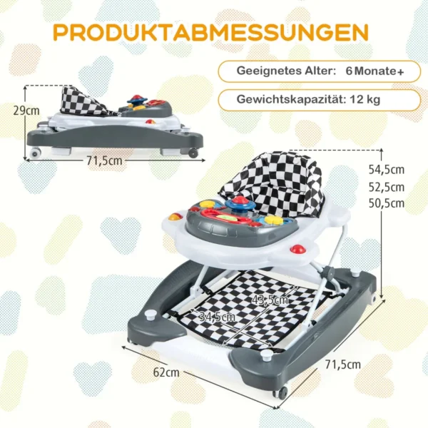 Vaikštynė 71,5x62x54,5 cm, pilkos ir baltos spalvos, skirta skatinti ankstyvą kūdikio judėjimo ir vystymosi įgūdžių ugdymą. Ši daugiafunkcinė vaikštynė prisitaiko prie vaiko poreikių nuo sėdėjimo iki vaikščiojimo, užtikrindama saugumą ir patogumą.