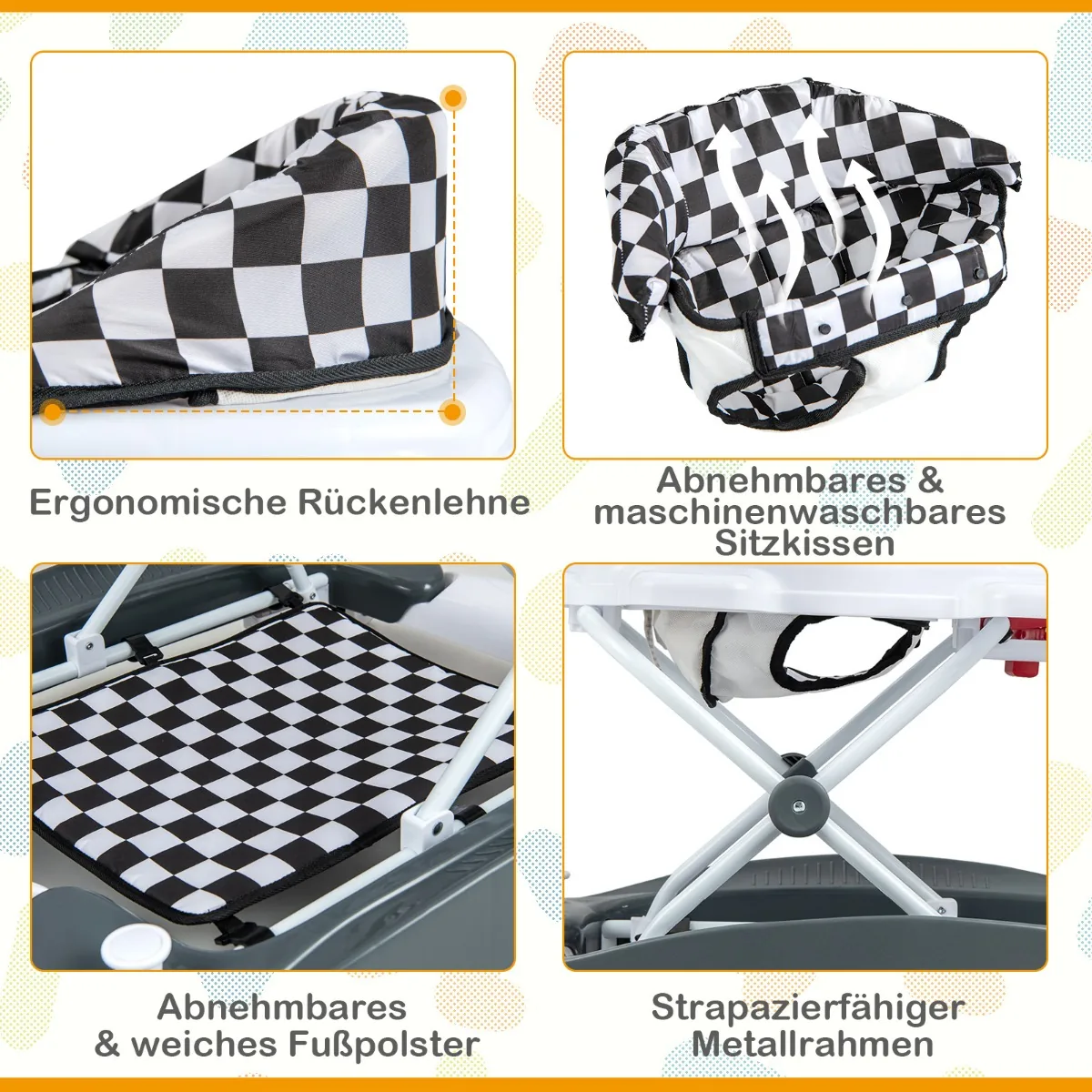 - Universali vaikštynė su 6 skirtingais naudojimo režimais: siūbavimas, rankinis stūmimas, džempris, vaikštynė, valgymas ir ankstyvasis ugdymas.