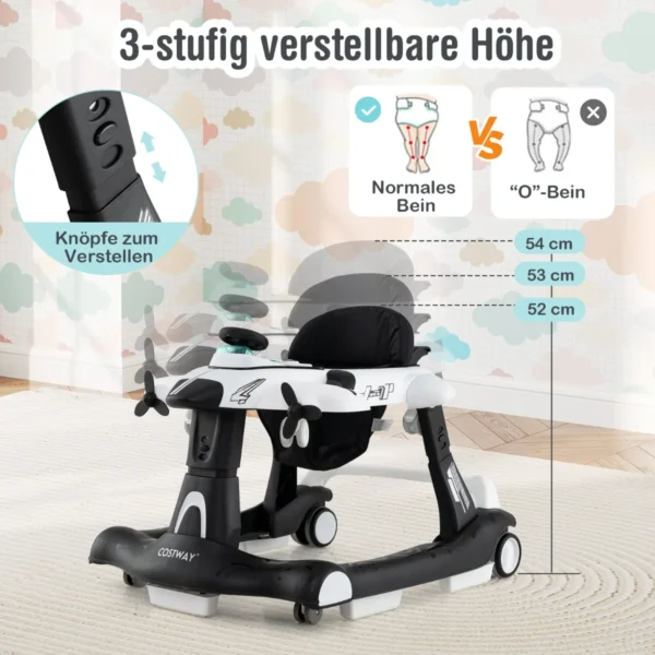 Vaikštynė 72,5x64x54 cm baltos ir juodos spalvos skirta padėti vaikams nuo 6 iki 18 mėnesių išmokti vaikščioti ir saugiai tyrinėti aplinką. Daugiafunkcinis dizainas ir keli aukščio nustatymai užtikrina komfortą ir prisitaikymą prie besikeičiančių mažylio poreikių.