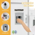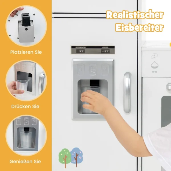Vaikų virtuvė 100x50x81cm, baltos spalvos yra skirta vaikams nuo 3 metų. Šis medinis kampinis žaidimų virtuvės komplektas suteikia realistišką maisto gaminimo patirtį su šviesos ir garso efektais. Dėl kampinio dizaino virtuvę galima patogiai pastatyti net mažose erdvėse, pvz., vaikų kambaryje ar darželyje.