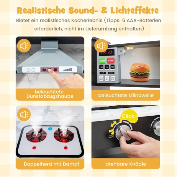 • Realistiški garso ir šviesos efektai mikrobangų krosnelėje, gartraukio ir viryklėje (reikalingos 6 AAA baterijos, nepridedamos).