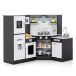 Vaikų virtuvė 100x50x81cm skirtas skatinti vaikų kūrybiškumą ir vaidmenų žaidimus. Šis medinis kampinis žaidimų virtuvės komplektas turi realistiškus šviesos ir garso efektus, leidžiančius vaikams įsijausti į maisto gamybos procesą. Dėl kompaktiško dizaino ji idealiai tinka mažoms erdvėms darželyje ar namuose.
