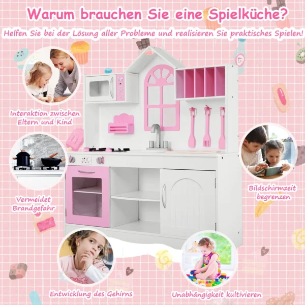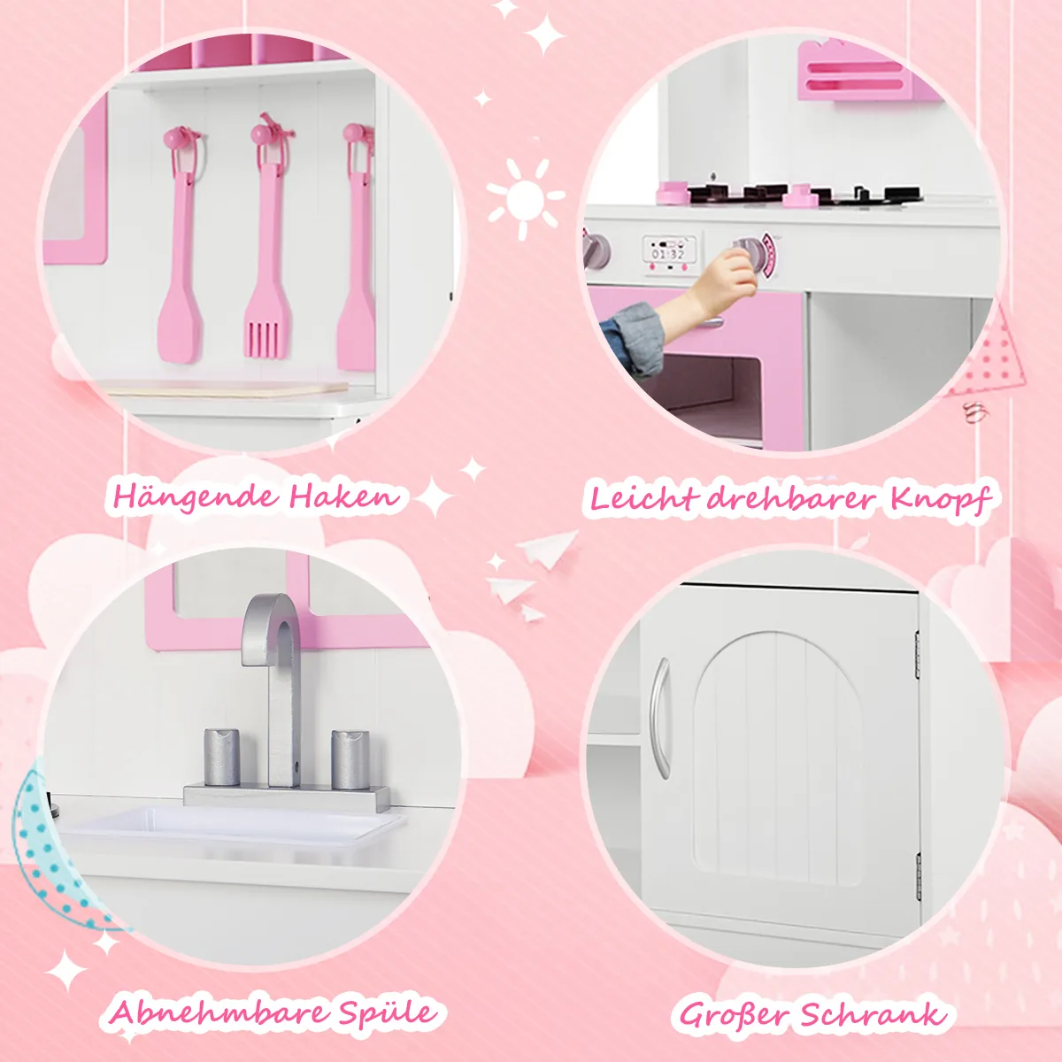 Vaikų virtuvė 106,5x32x109cm baltos ir rožinės spalvos yra medinis žaidimų rinkinys, skirtas vaikams nuo 3 metų. Ši vaikų virtuvė suteikia galimybę lavinti vaizduotę ir praktinius įgūdžius per vaidmenų žaidimus. Komplekte yra tikroviškos detalės ir saugios medžiagos, užtikrinančios ilgaamžiškumą.