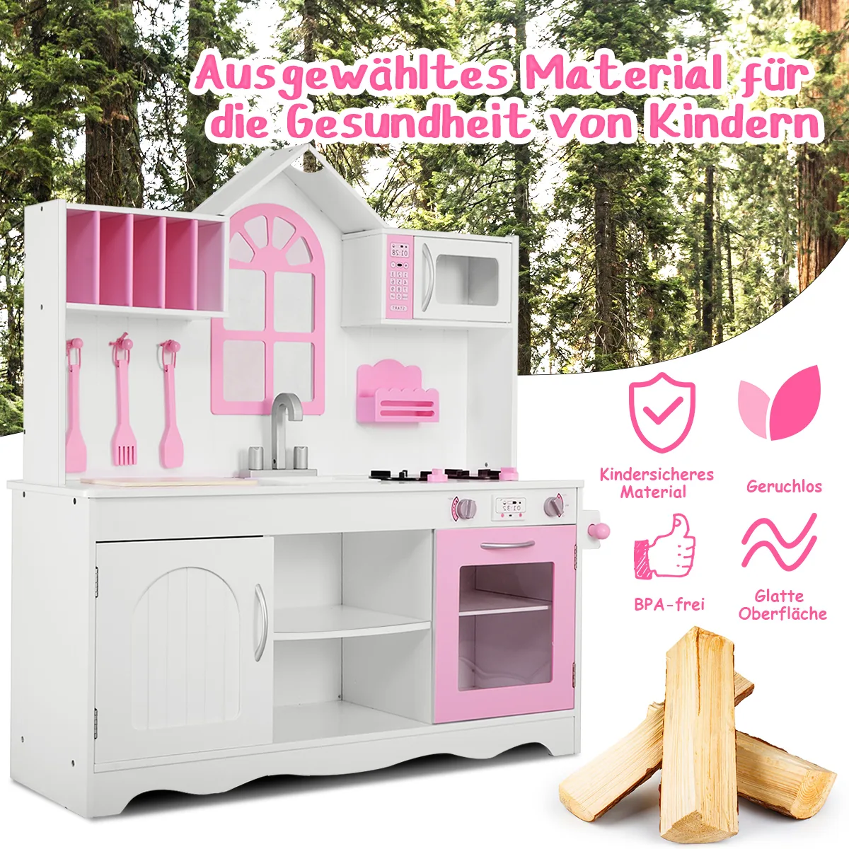 - Medinis vaikiškas virtuvės žaidimų rinkinys, pagamintas iš MDF ir pušies medienos.