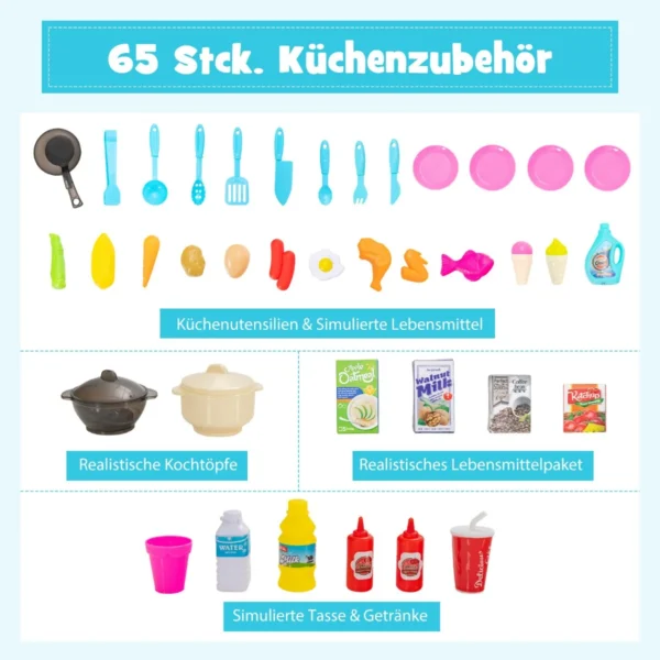 Vaikų virtuvė 45x26x79cm įvairių spalvų – daugiafunkcis žaidimų rinkinys, skirtas vaikų vaizduotei ir praktiniams įgūdžiams lavinti. Šis žaislas su realistiškomis šviesomis, garsais ir garų efektais leidžia vaikams vaidinti maisto gamybą namuose.
