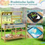 - Įrengta su dviem viryklėmis, rankenėlėmis bei universalia kriaukle, kuri tinka žaidimui su vandeniu arba smėliu.