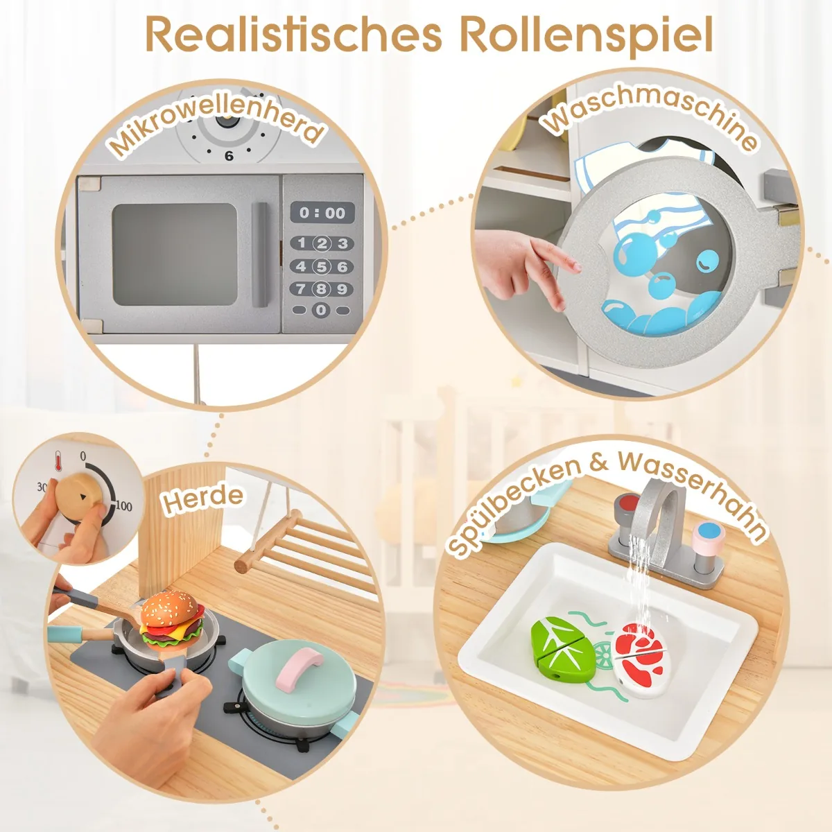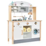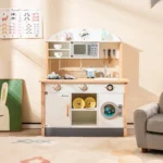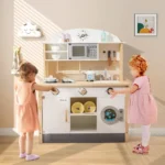 Vaikų virtuvė 79x35x98cm yra medinis žaislas, skirtas ugdyti vaikų kūrybiškumą ir vaidmenų žaidimus. Ši žaidimų virtuvė turi realistiškų elementų, tokių kaip viryklės, mikrobangų krosnelė ir kriauklė, kurie skatina vaikų vaizduotę bei organizacinius įgūdžius. Puikiai tinkama vaikams nuo 3 metų, suteikia daug vietos žaidimui ir priedams laikyti.