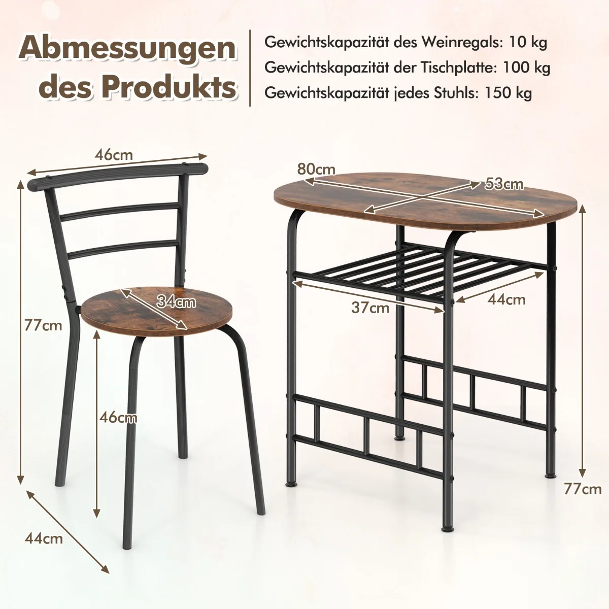 Valgomojo baldų komplektas 3 dalių, rudos ir juodos spalvos, puikiai tinka mažoms virtuvėms ar valgomiesiems. Komplekte yra praktiškas ovalus valgomojo stalas su vyno lentyna ir dvi ergonomiškos kėdės, užtikrinančios patogų sėdėjimą. Šis komplektas padeda efektyviai išnaudoti erdvę ir suteikia vietą maistui, gėrimams bei indams.