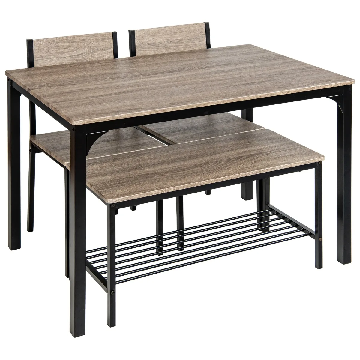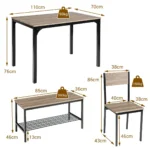 Valgomojo baldų komplektas 4 dalių, rudos/juodos spalvos, puikiai tiks jūsų namų valgomojo erdvei. Šis komplektas apima stalą, suolą ir dvi kėdes, sukurtas keturių žmonių poreikiams patenkinti. Baldai pagaminti iš MDF ir metalo, pasižymi patvarumu ir funkcionalumu.