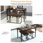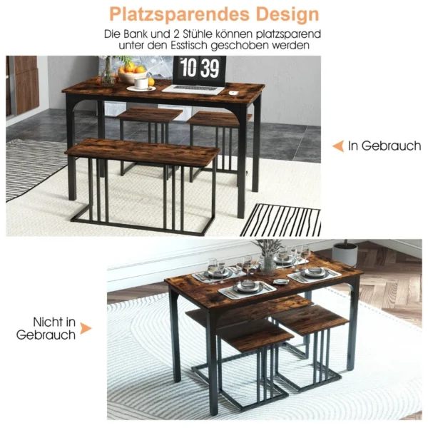 Valgomojo baldų komplektas 4 dalių, rudos ir juodos spalvos, suteikia funkcionalią ir patvarią valgomojo zoną. Komplektą sudaro valgomojo stalas, suolas ir dvi kėdės, pritaikytos iki 4 asmenų sėdimai vietai. Šis komplektas puikiai tinka įvairaus dydžio patalpoms, užtikrinant komfortą ir praktiškumą kasdieniam naudojimui.