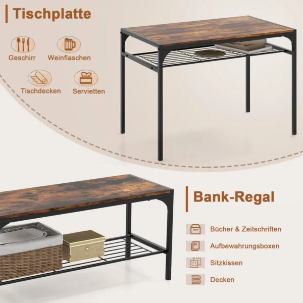 - Stalas turi laikymo lentyną po stalviršiu ir papildomas lentynas suole.