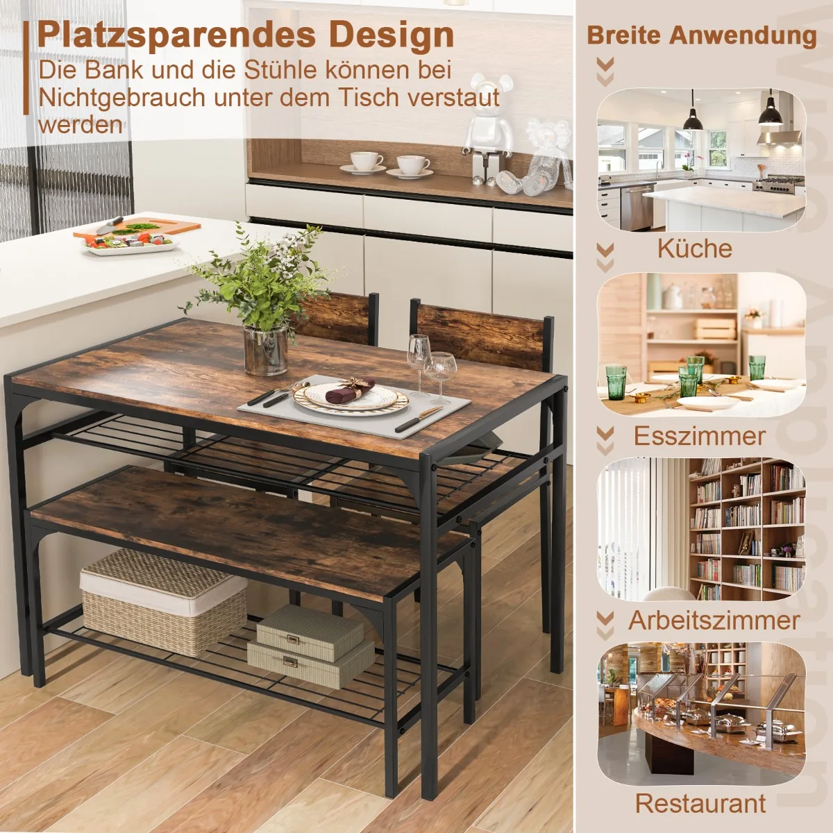 - Komplektas tinka įvairioms erdvėms: virtuvėms, valgomiesiems, kavinėms, biurams.