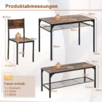 Valgomojo baldų komplektas 4 dalių, rudos ir juodos spalvos, skirtas patogiai ir funkcionaliai valgomojo erdvei. Komplektą sudaro stalas, 2 kėdės ir suolas, kurie puikiai tinka šeimos ar draugų susibūrimams. Baldų konstrukcija užtikrina stabilumą ir patvarumą, o papildomos lentynos padeda išlaikyti tvarką valgomojo zonoje.