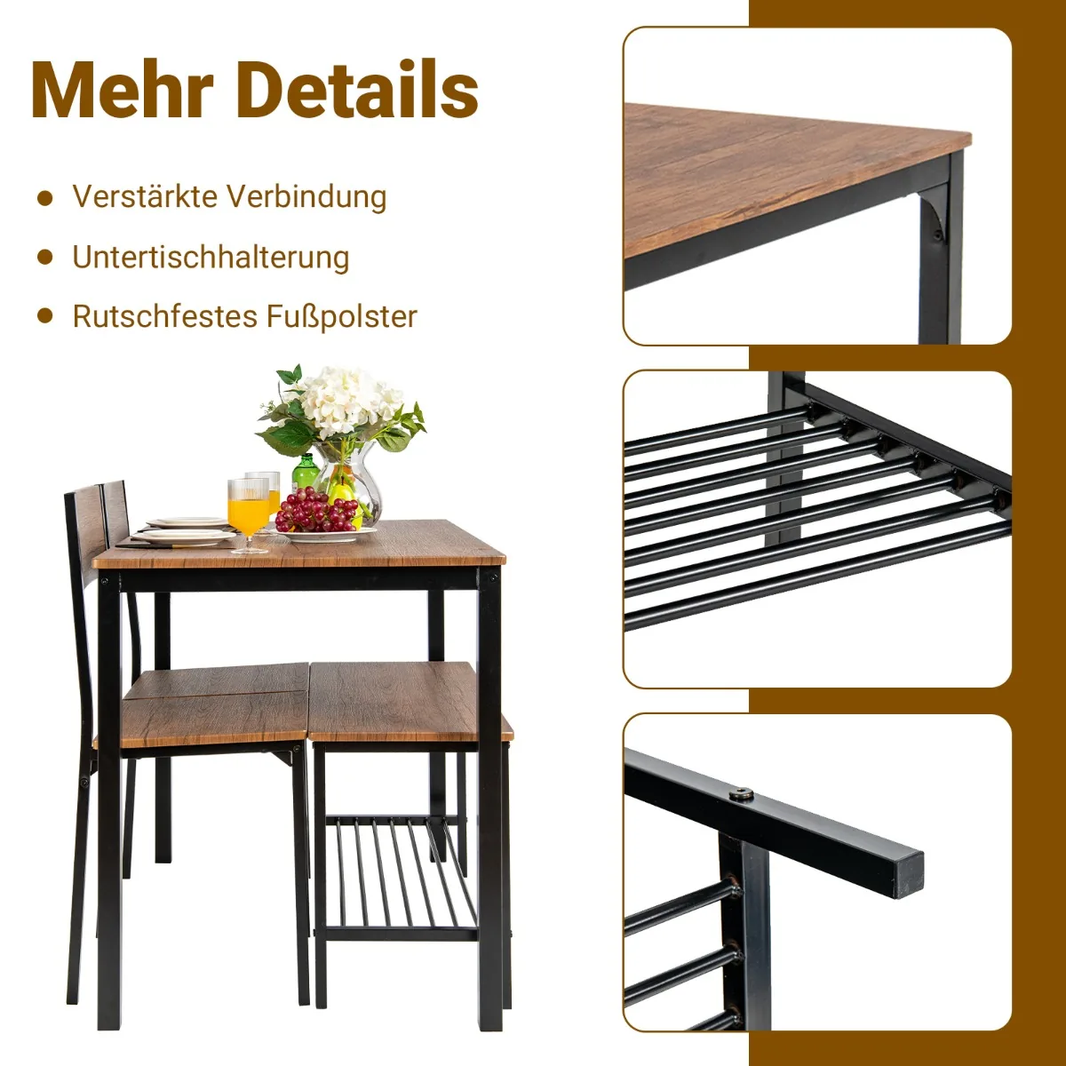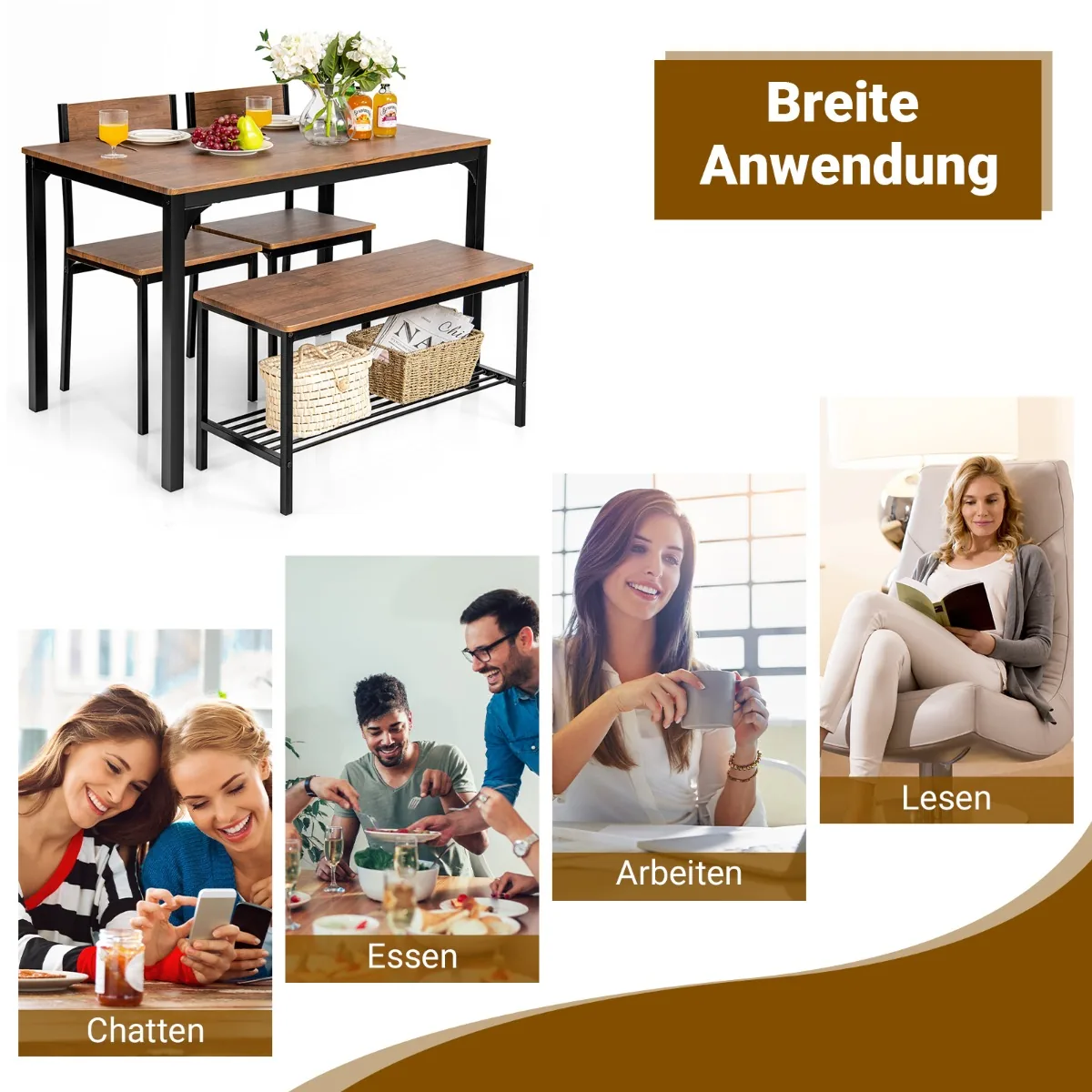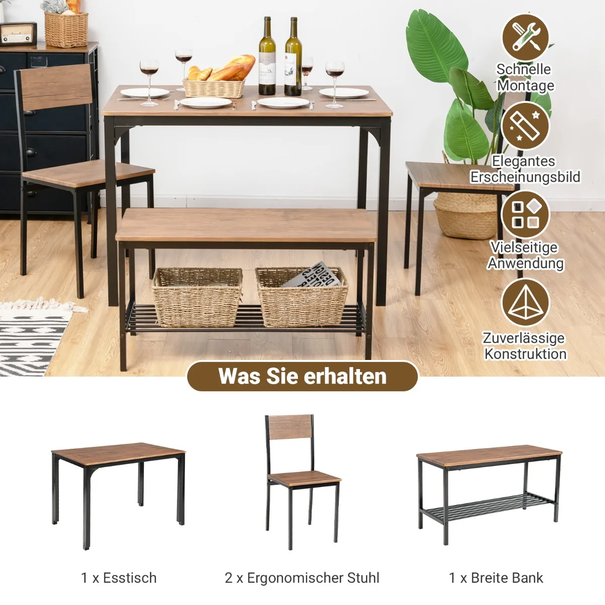 Valgomojo baldų komplektas 4 dalių, rudos ir juodos spalvos, skirtas keturių asmenų šeimai ar draugų susibūrimams. Komplektą sudaro stalas, suolas ir dvi kėdės, pagamintos iš MDF ir metalo, tinkamos naudoti įvairiose patalpose.