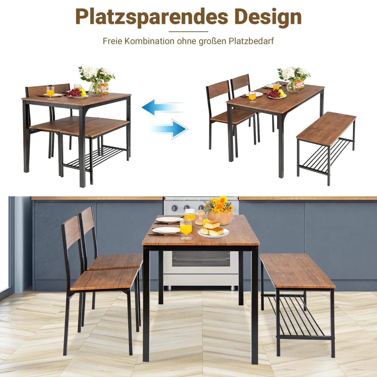 - Vieta taupantis dizainas – kėdes ir suolą galima paslėpti po stalu, todėl tinka mažoms erdvėms.