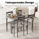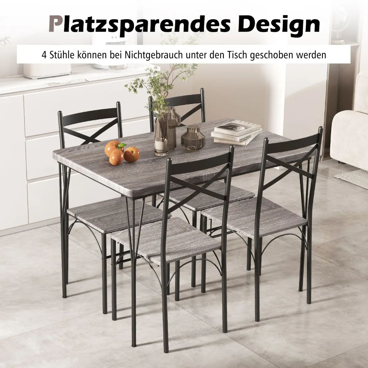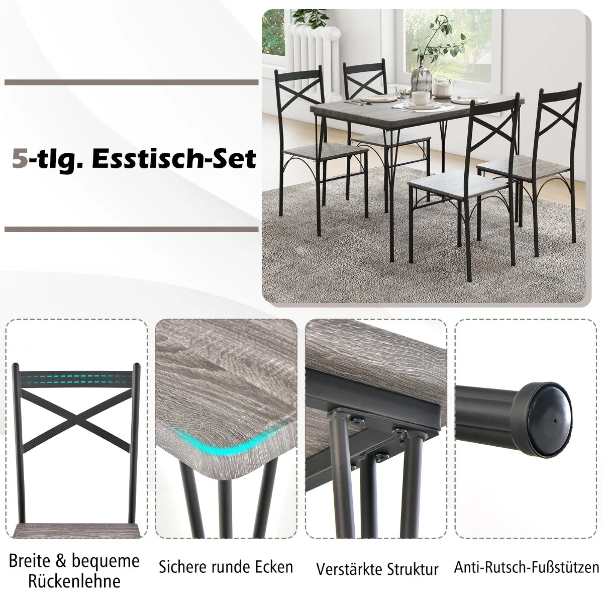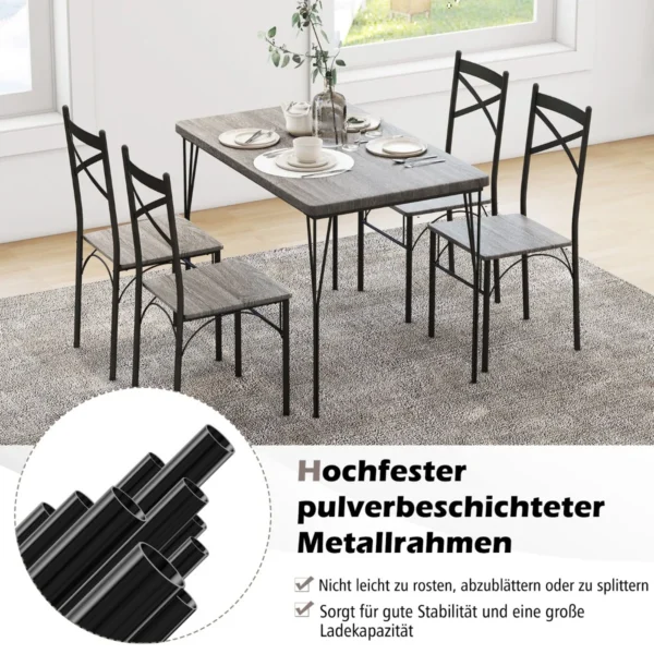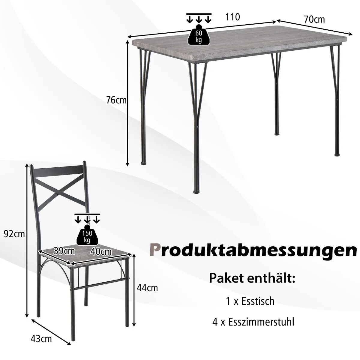 Valgomojo baldų komplektas 5 dalių, pilkos ir juodos spalvos, puikiai tinka namų ar biuro valgomojo erdvei. Komplektą sudaro stačiakampis stalas ir 4 ergonomiškos kėdės, kurios užtikrina patogų sėdėjimą ir patvarumą kasdieniam naudojimui.