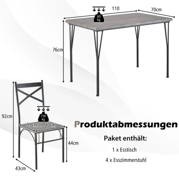 • 5 dalių baldų komplektą sudaro stačiakampis valgomojo stalas ir 4 kėdės, skirtos iki 4 asmenų.