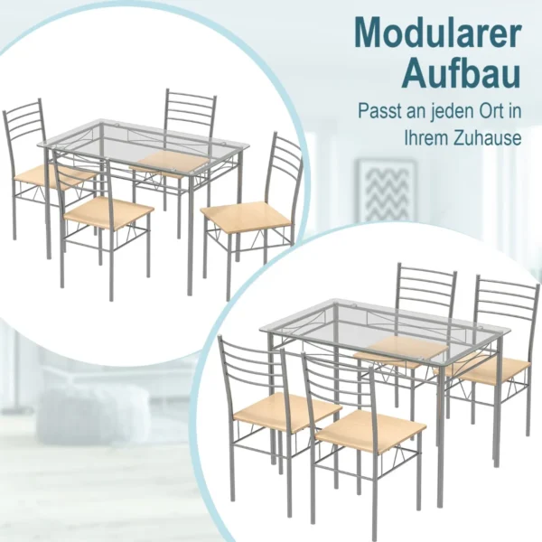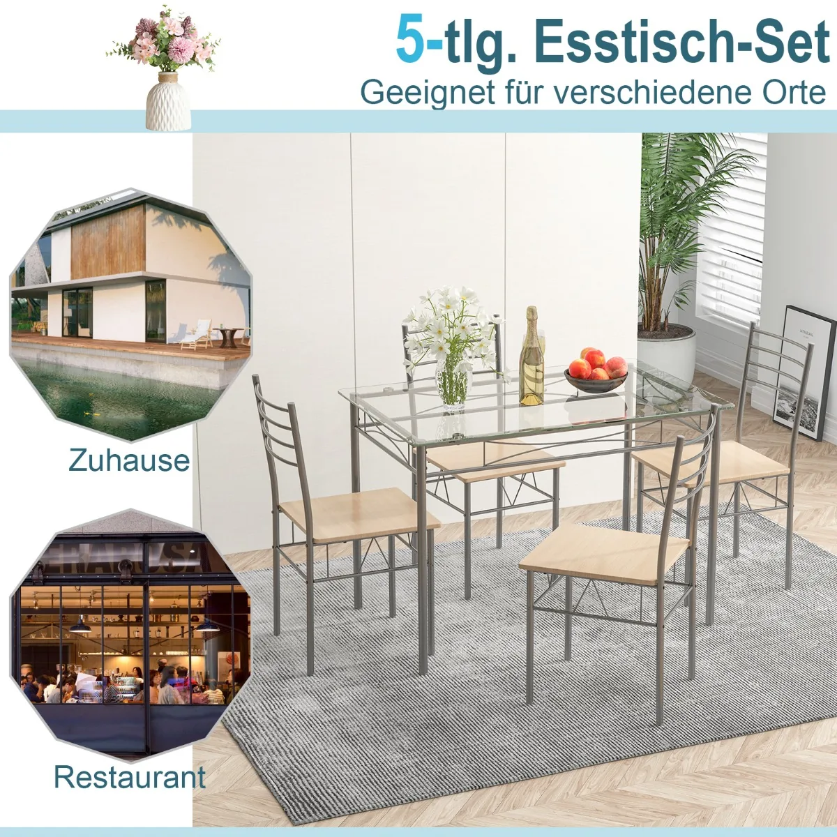Valgomojo baldų komplektas 5 dalių, sidabrinės ir šviesiai rudos spalvos, skirtas patogiam valgymui namuose ar viešose erdvėse. Komplektą sudaro grūdinto stiklo valgomojo stalas ir keturios kėdės su aukštu atlošu, kurios dera prie įvairaus interjero stilių.