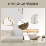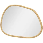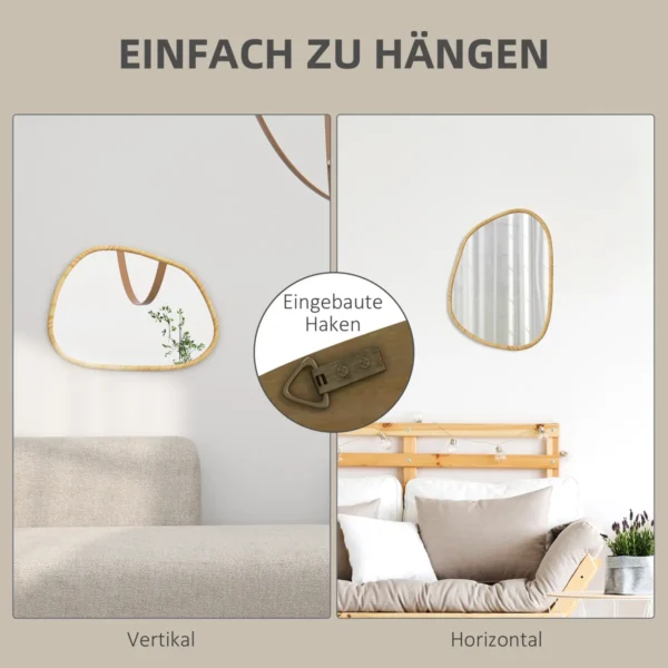 • ✔ Netaisyklingos formos dekoratyvinis veidrodis su horizontaliu pušies medienos rėmu suteikia jūsų namams unikalų vertikalaus tvirtinimo elementą.
