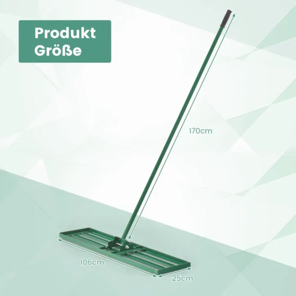 Vejos lyginimo grėblys 106x25x170cm, žalios spalvos, skirtas efektyviam vejos priežiūros darbų atlikimui. Įrankis padeda palaikyti lygų ir tvarkingą vejos paviršių tiek kiemuose, tiek soduose ar golfo aikštynuose. Tvirtas ir lengvai naudojamas grėblys patenkins įvairius lyginimo poreikius.