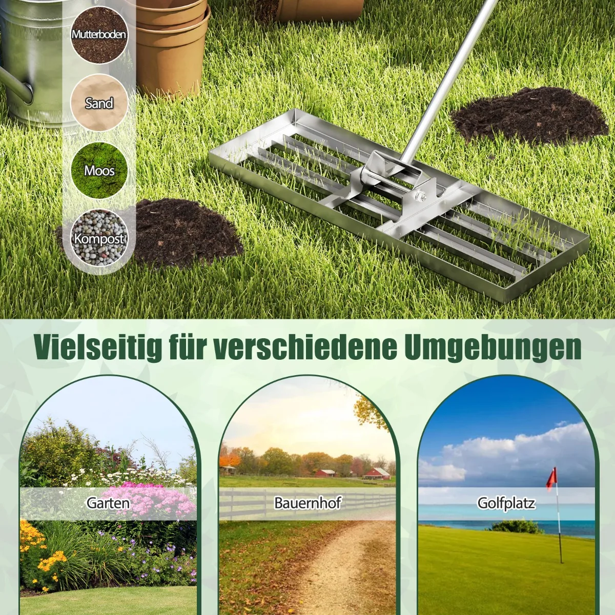 - Tinka įvairių tipų žolei, dirvožemiui, smėliui, durpėms ir kompostui.