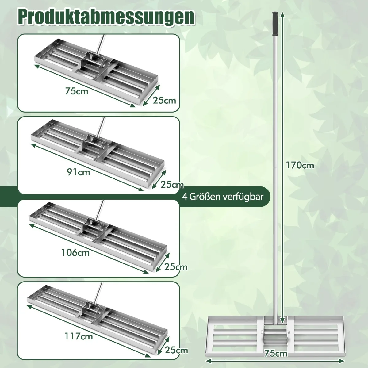 - Grėblys turi 75 x 25 cm plokštę, leidžiančią greitai išlyginti veją ir pašalinti akmenis bei gumulėlius.
