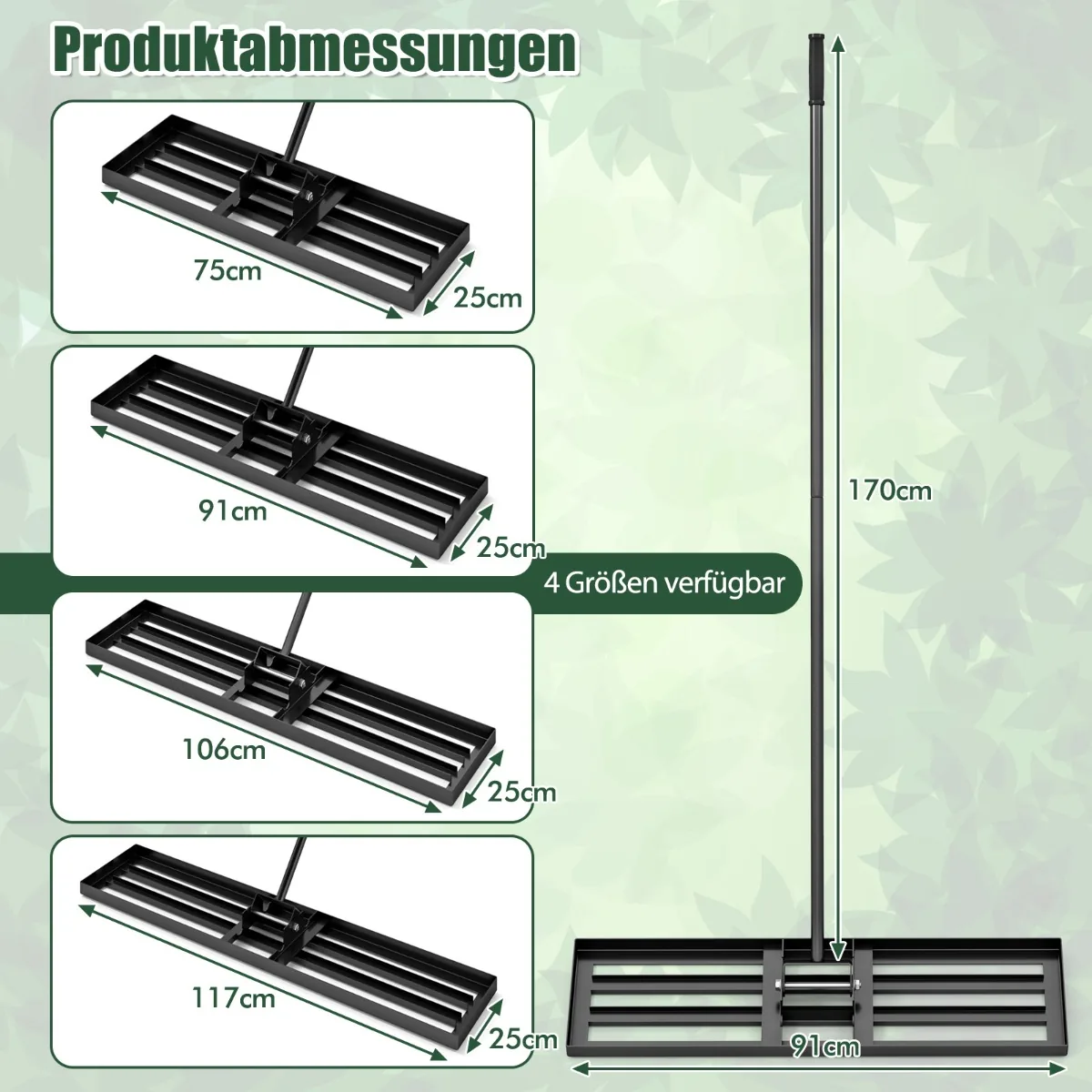 Vejos lyginimo grėblys 91x25x170 cm, juodos spalvos, skirtas efektyviai vejos priežiūrai. Šis sodo įrankis padeda išlyginti žemės paviršių, pašalinti akmenis ir suskaidyti gumulėlius, taip užtikrinant lygų ir tvarkingą vejos vaizdą.