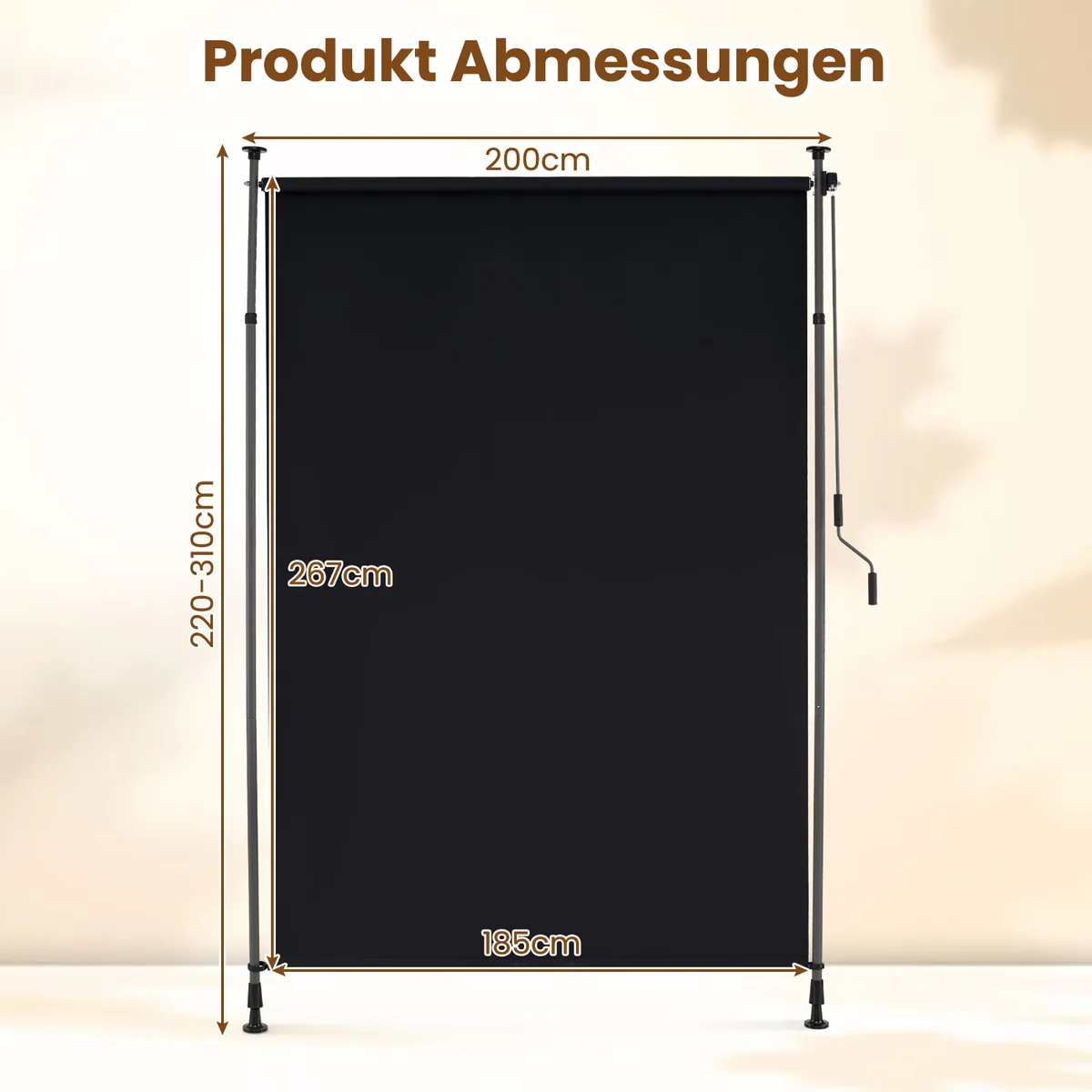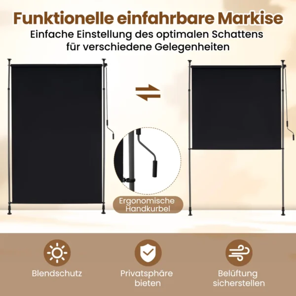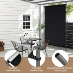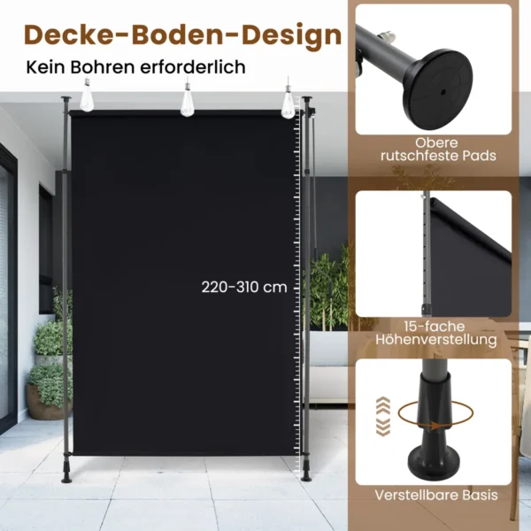 Vertikali markizė 200×310 cm juodos spalvos yra praktiškas sprendimas lauko erdvių šešėliavimui ir privatumo užtikrinimui. Ji pagaminta iš poliesterio su PA danga, kuri efektyviai blokuoja saulės spindulius. Reguliuojamos aukšties konstrukcija prisitaiko prie skirtingų lubų aukščių.