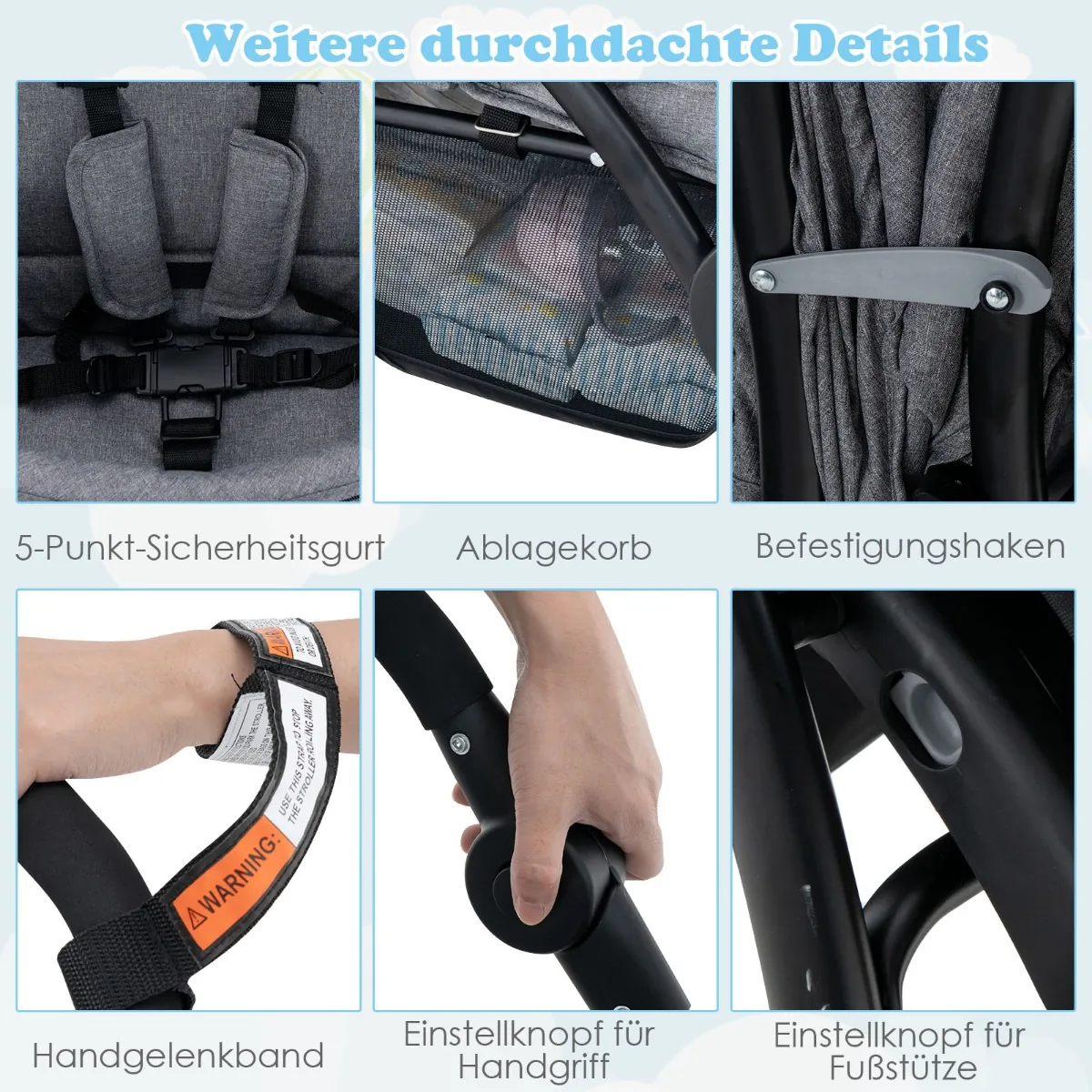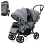 Vežimėlis 123x57x110cm, pilkos ir juodos spalvos, skirtas dviejų vaikų kasdieniam naudojimui. Dvivietis vežimėlis pasižymi lengvu sulankstymu ir patogia rankena, todėl yra praktiškas tiek namuose, tiek kelionėse. Reguliuojamos sėdynės ir saugos diržai užtikrina komfortą ir saugumą įvairaus amžiaus vaikams.