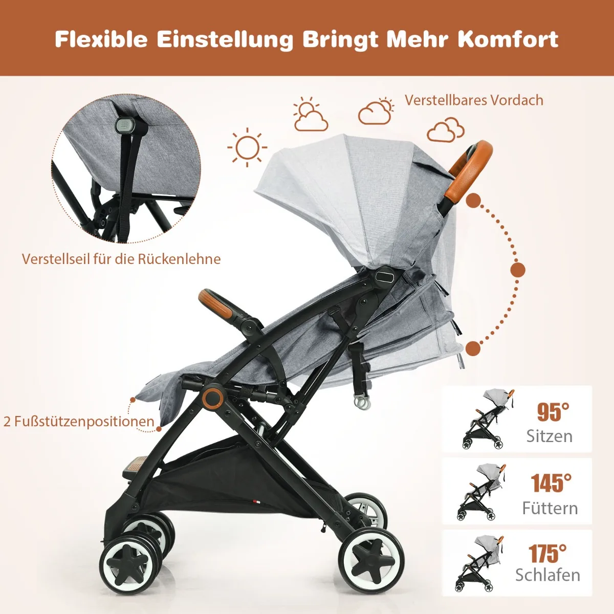 - Reguliuojamas atlošas nuo 95° iki 175° ir pėdų atrama užtikrina patogią kūdikio poziciją.