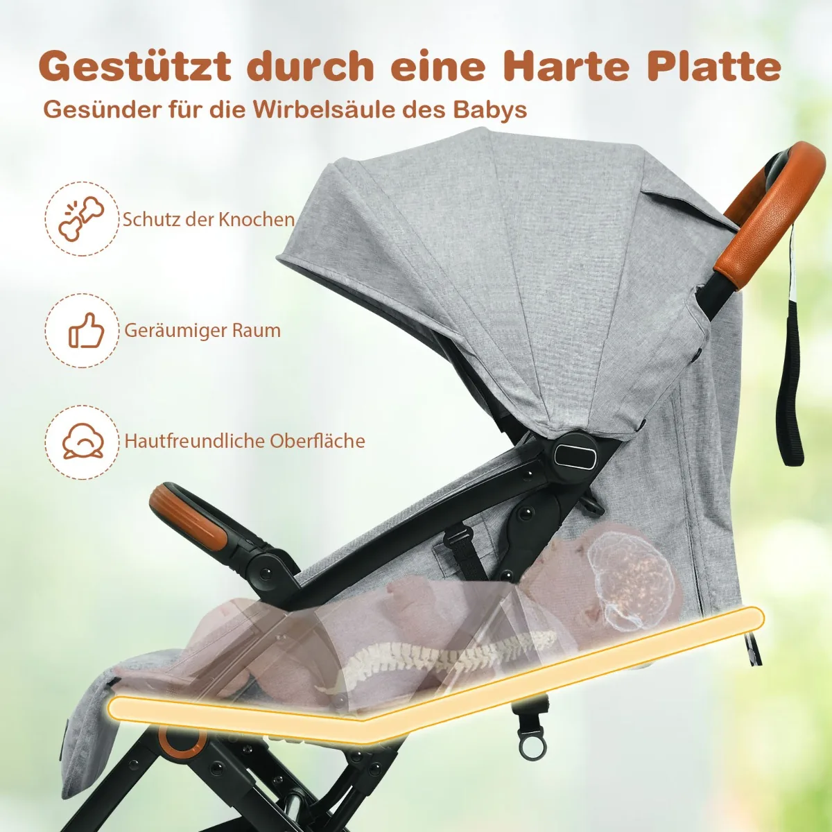 - Reguliuojamas atlošas ir pėdų atrama prisitaiko prie augančio kūdikio poreikių.