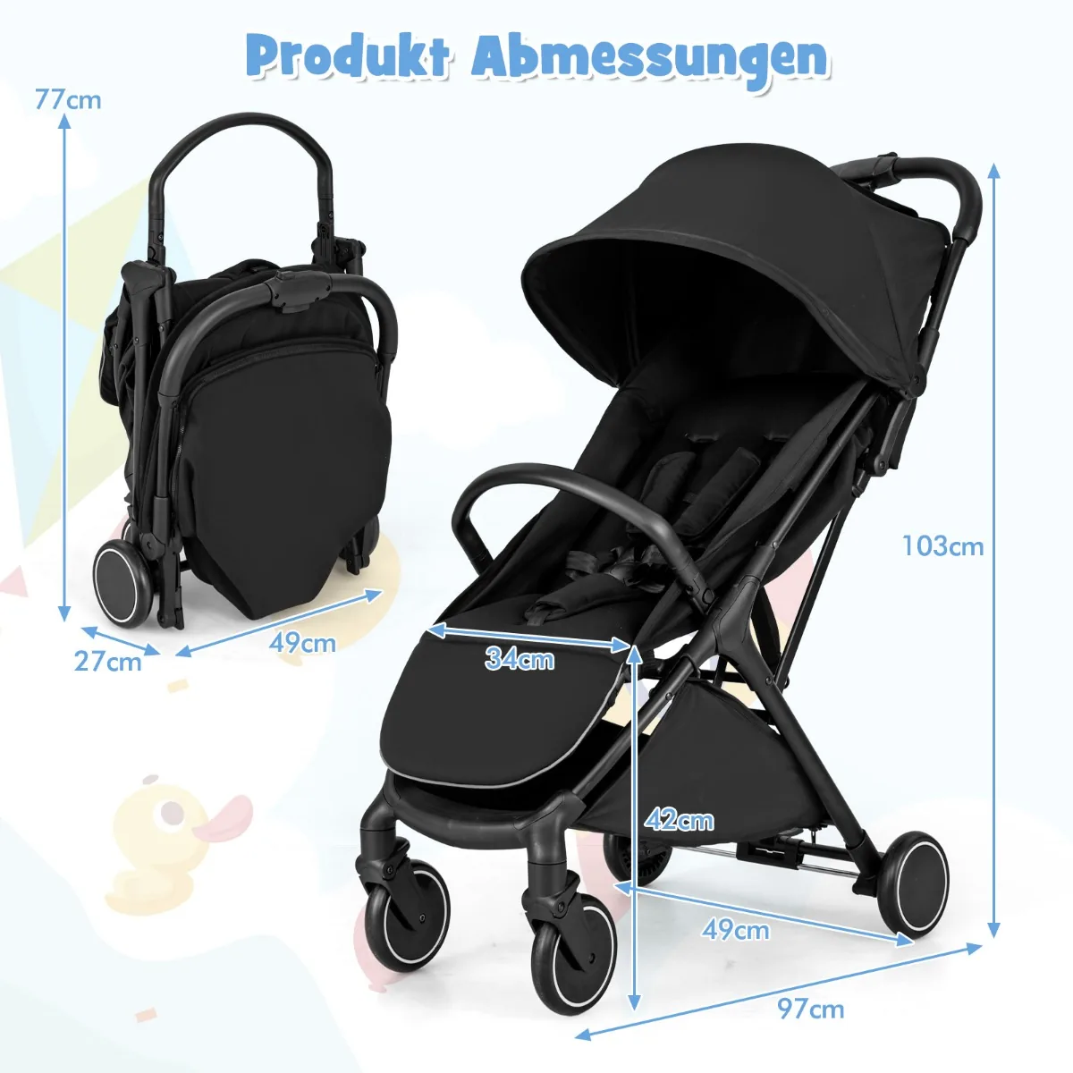 Vežimėlis 97x49x103cm juodos spalvos – patogus ir funkcionalus sprendimas kasdienėms išvykoms. Lengvas ir kompaktiškas kelioninis vežimėlis su reguliuojamu atlošu, kojų atrama ir saugos diržais užtikrina komfortą ir saugumą jūsų vaikui.