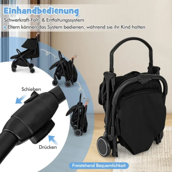 - Vežimėlį lengva sulankstyti ir išskleisti viena ranka, jis gali stovėti savarankiškai sulankstytas.