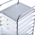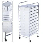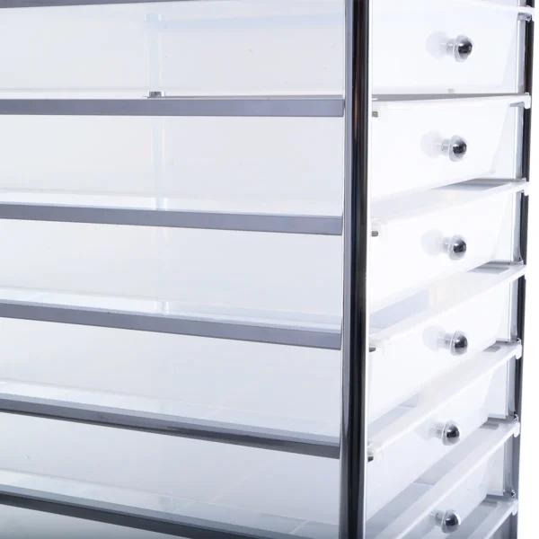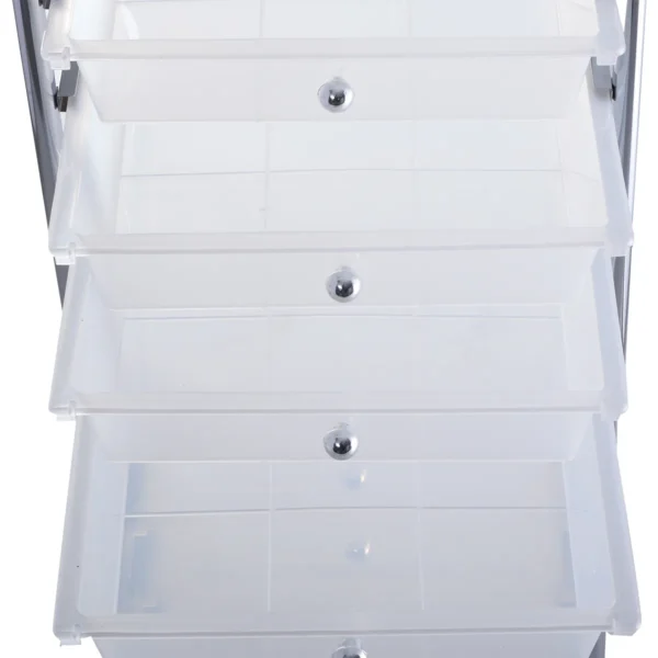 Vežimėlis su stalčiais 33x37x86cm, baltos ir sidabrinės spalvos, skirtas įvairioms saugojimo reikmėms tiek namuose, tiek profesinėse erdvėse. Mobilus ir funkcionalus, jis puikiai tinka voniai, biurui, kirpykloms ar grožio salonams. Daug stalčių ir ratukų dėka daiktų organizavimas tampa patogus ir lengvas.