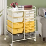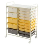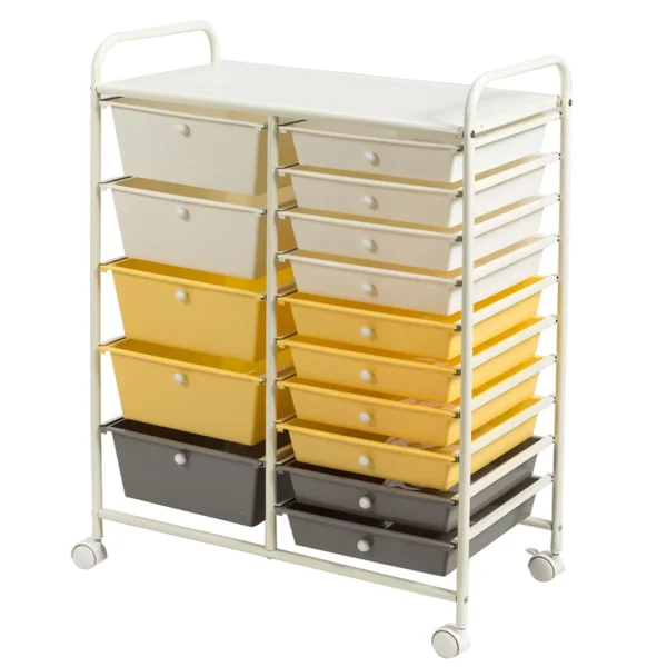 - Universalus vežimėlis su 15 plastikinių stalčių ir lentyna patogiam daiktų laikymui.