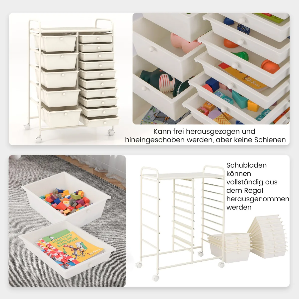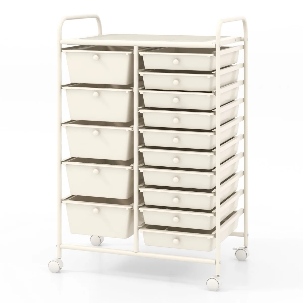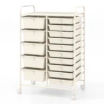 Vežimėlis su stalčiais 63x37x87 cm, kreminės spalvos, skirtas patogiam daiktų laikymui įvairiose erdvėse. Šis metalinis vežimėlis su 15 išimamų PP stalčių užtikrina efektyvią organizaciją ir lengvą mobilumą.