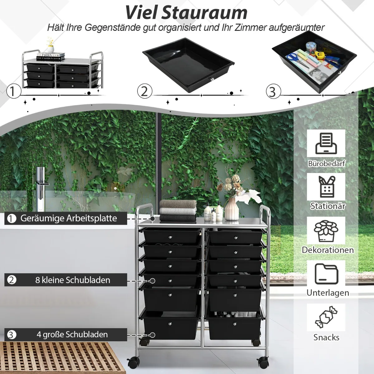 Vežimėlis su stalčiais 64x38x75cm, juodos ir sidabrinės spalvos, yra praktiškas sprendimas daiktų laikymui ir organizavimui namuose, biure ar garaže. Šis mobilus vežimėlis turi 12 stalčių, užtikrinančių pakankamai vietos įvairiems įrankiams, dokumentams ar buities reikmenims.