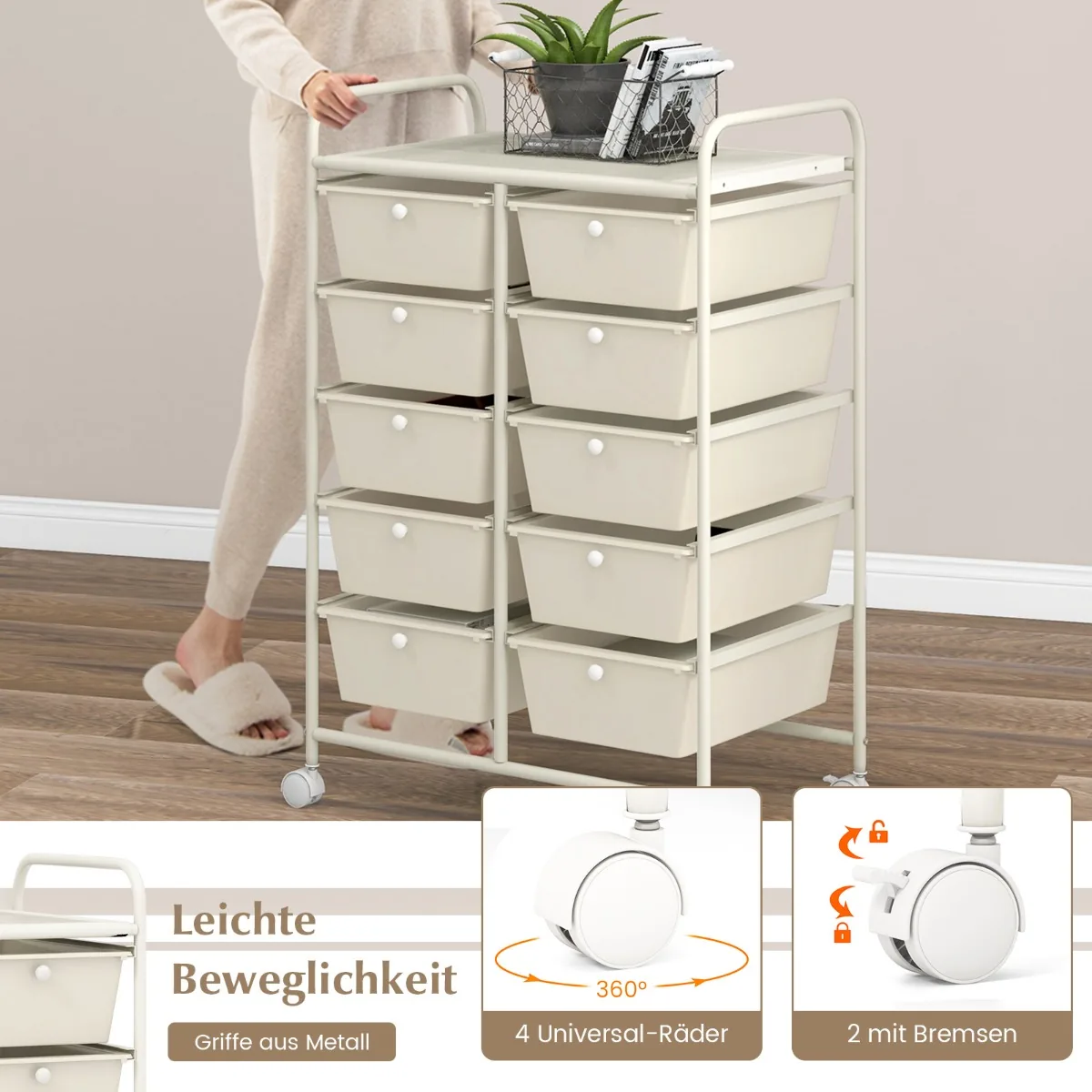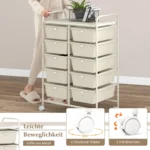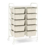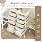 - Vežimėlis turi 1 didelę viršutinę platformą (58,5 x 37 cm) ir 10 nuimamų stalčių (34 x 26 x 12 cm), skirtų įvairiems įrankiams, popieriams ar biuro reikmenims laikyti.