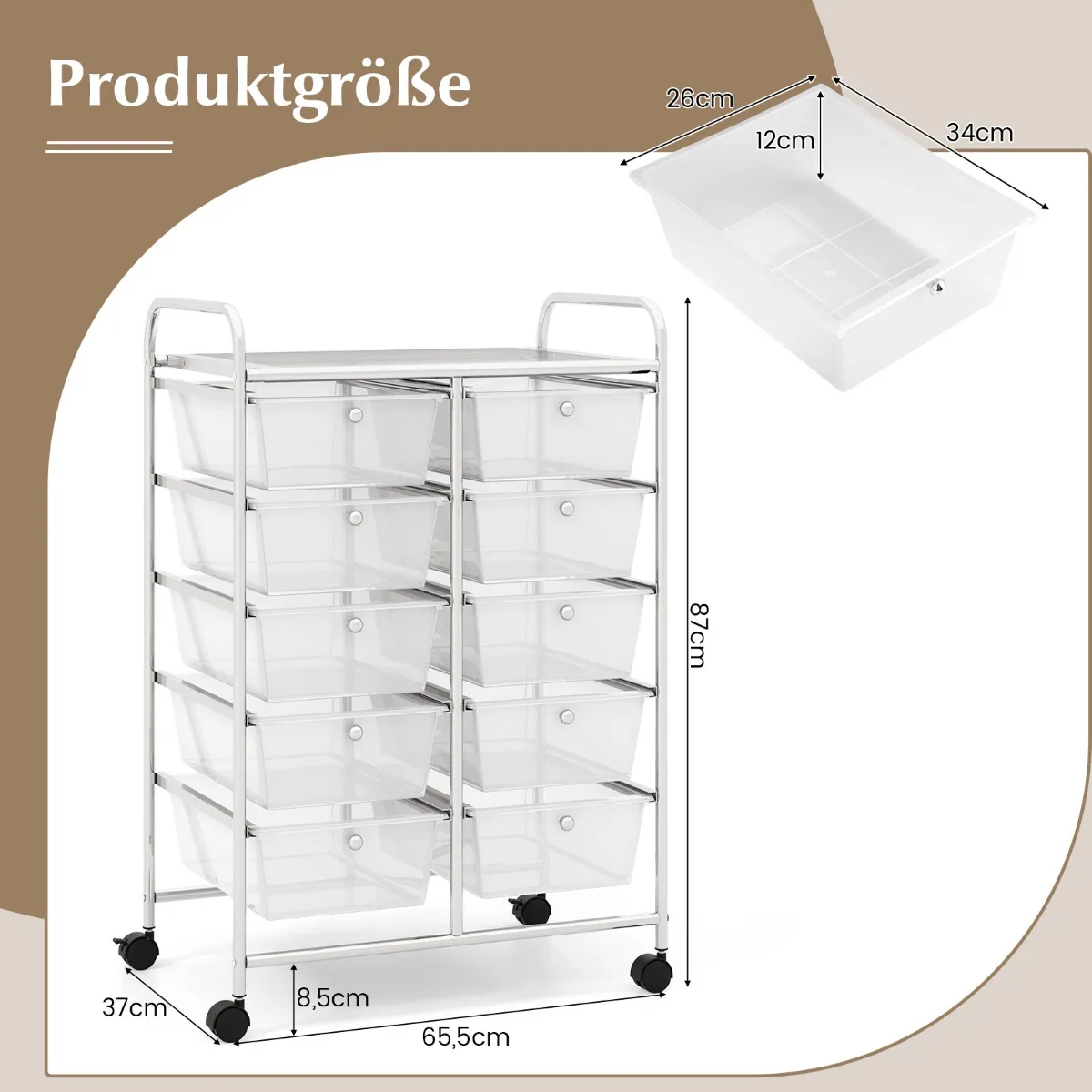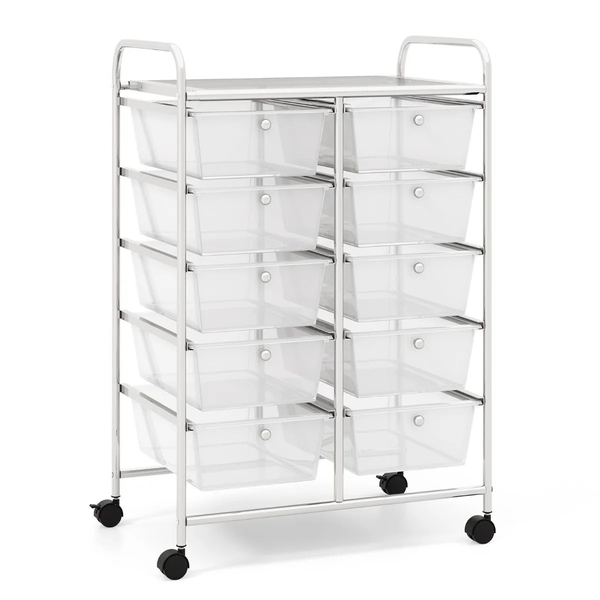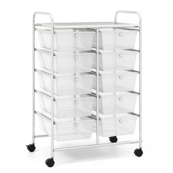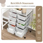 - Mobilus vežimėlis su 10 erdvių stalčių įvairių daiktų saugojimui.