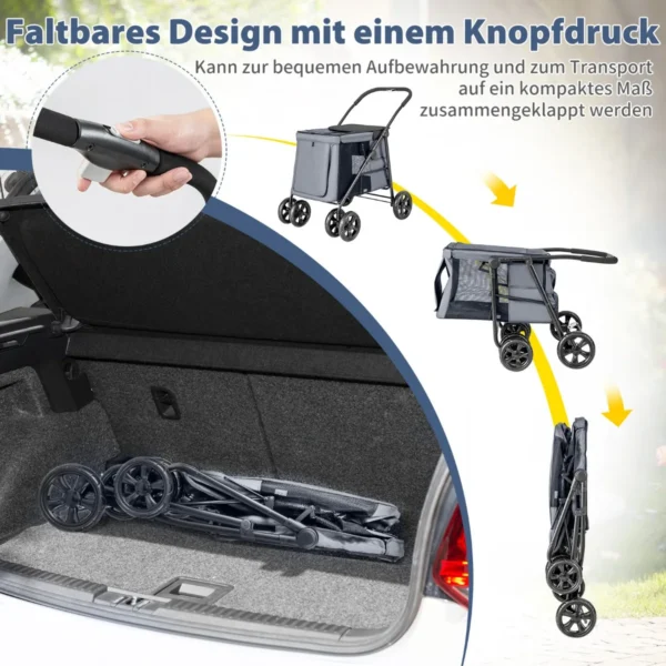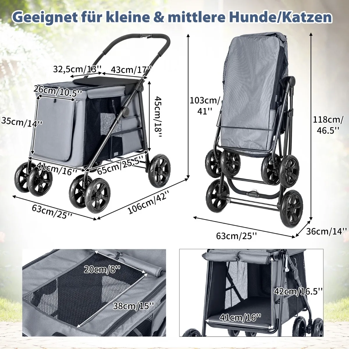 Vėžimėlis šunims 106x63x103 cm, pilkos ir juodos spalvos, skirtas patogiam ir saugiam jūsų augintinio vežimui. Pagamintas iš tvirto Oksfordo audinio ir metalinio rėmo, jis užtikrina ilgalaikį naudojimą ir gerą oro cirkuliaciją. Vežimėlis puikiai tinka lauko pasivaikščiojimams bei kelionėms su šunimi ar kitu mažesniu gyvūnėliu.