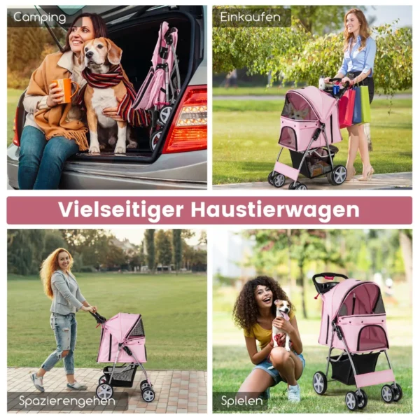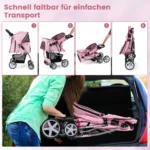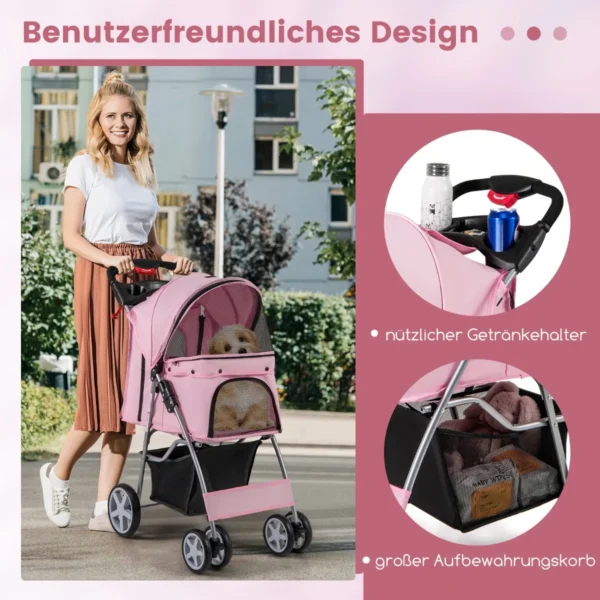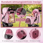 Vėžimėlis šunims 87x46x102 cm rožinės ir juodos spalvų derinyje skirtas patogiam mažų ir vidutinio dydžio augintinių vežimui. Jis suteikia galimybę lauke saugiai ir patogiai išvesti augintinį, kuris dėl amžiaus ar sveikatos negali daug vaikščioti.
