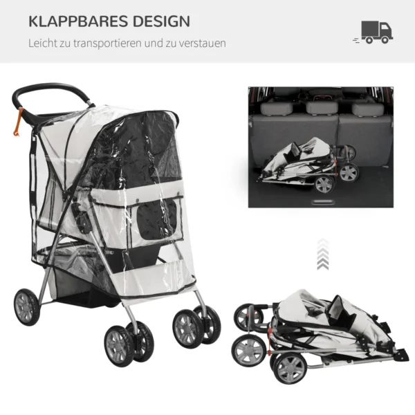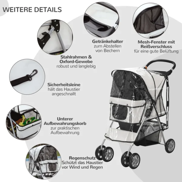 Šis šunų vežimėlis PawHut 75x45x97 cm, šviesiai pilkos ir juodos spalvos, yra puikus sprendimas jūsų augintinių transportavimui. Nesvarbu, ar tai būtų vizitas pas veterinarą, pasivaikščiojimas gryname ore, ar kelionė – šis vežimėlis yra idealus palydovas mažiems augintiniams. Tinklelio langai užtikrina gerą matomumą, ventiliaciją ir apsaugą nuo vabzdžių. PawHut vežimėlis yra saugumo ir komforto derinys jūsų augintiniams.