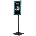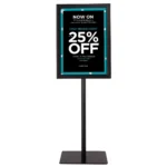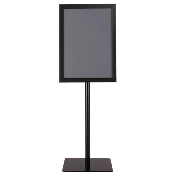 Vienpusis informacinis stovas 42×29,5×123 cm, juodos spalvos, skirtas efektyviam informacijos pateikimui viešose vietose. Aliuminio rėmas ir nerūdijančio plieno stovas užtikrina patvarumą bei stabilumą. Stovas tinkamas reklamai, pranešimams ar akcijų pristatymui įvairiose aplinkose.