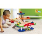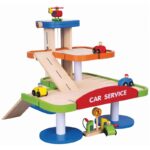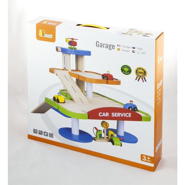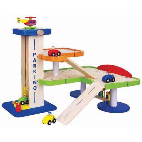 Gražus erdvus, linksmų spalvų žaislinis garažas su sraigtasparnio platforma, degaline ir liftu. Apima keturis automobilius ir malūnsparnį. Žaidimas su šiuo žaisliniu automobilių garažu skatina vaikų smulkiąją motoriką, spalvų atpažinimą ir kūrybiškumą.