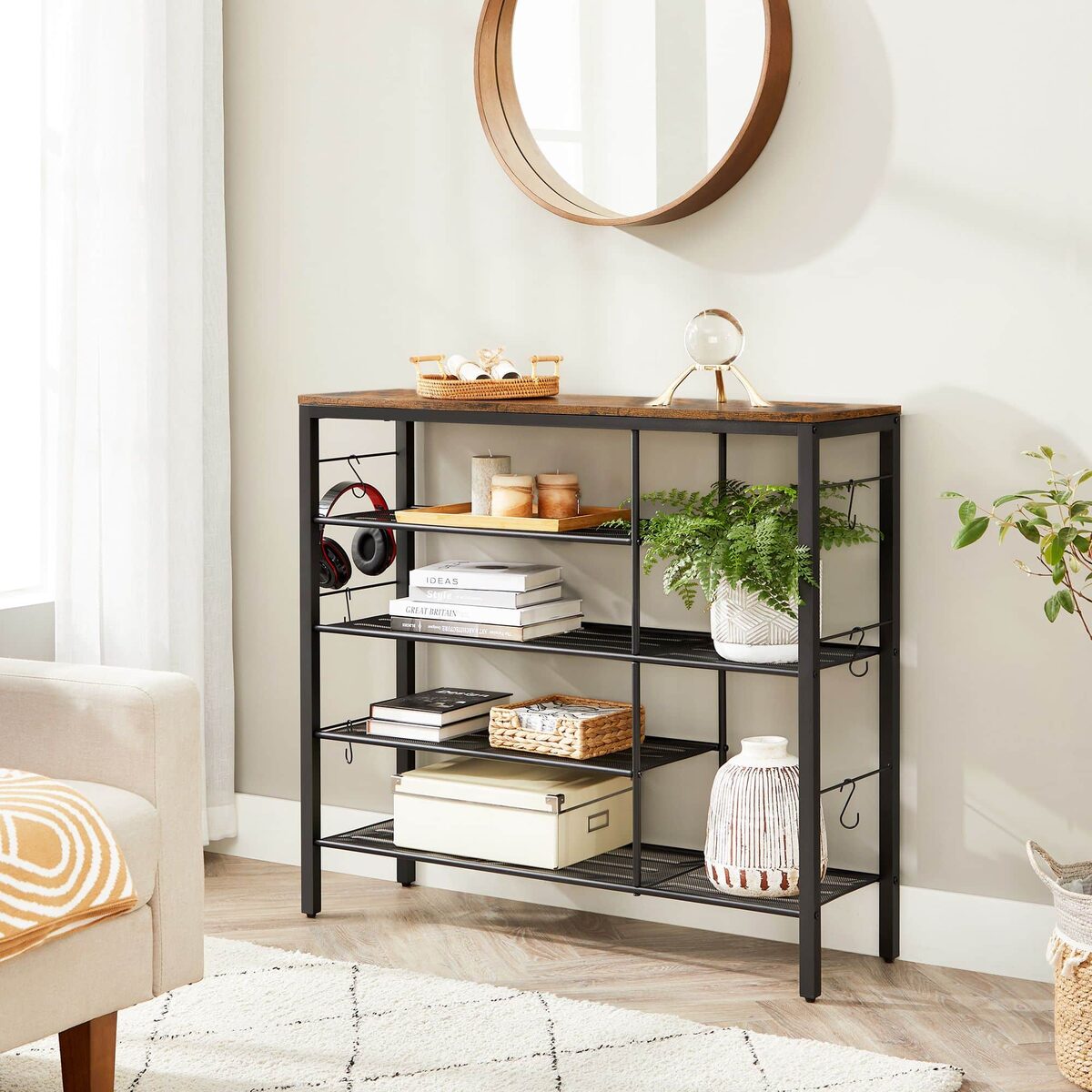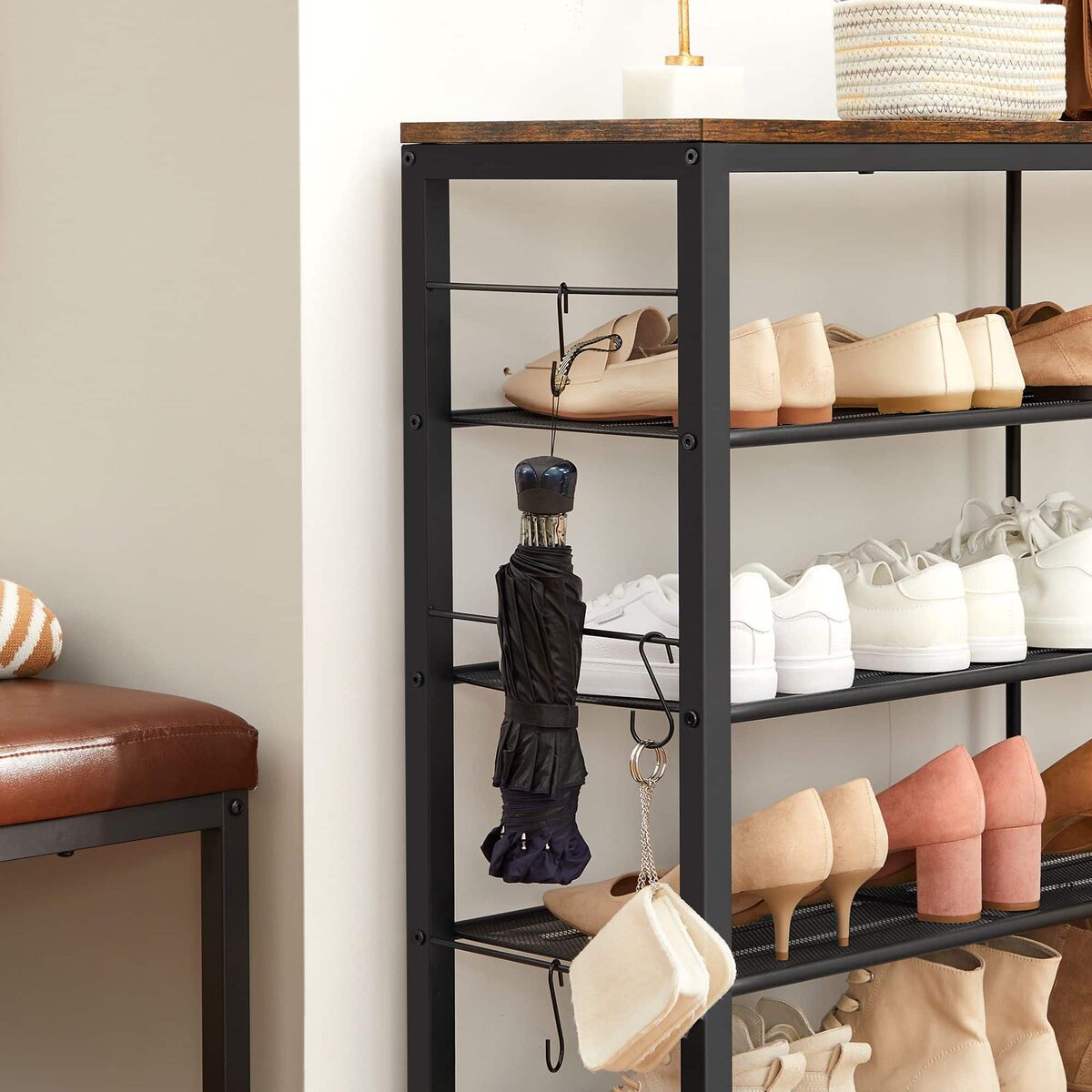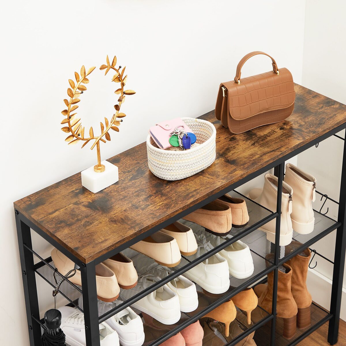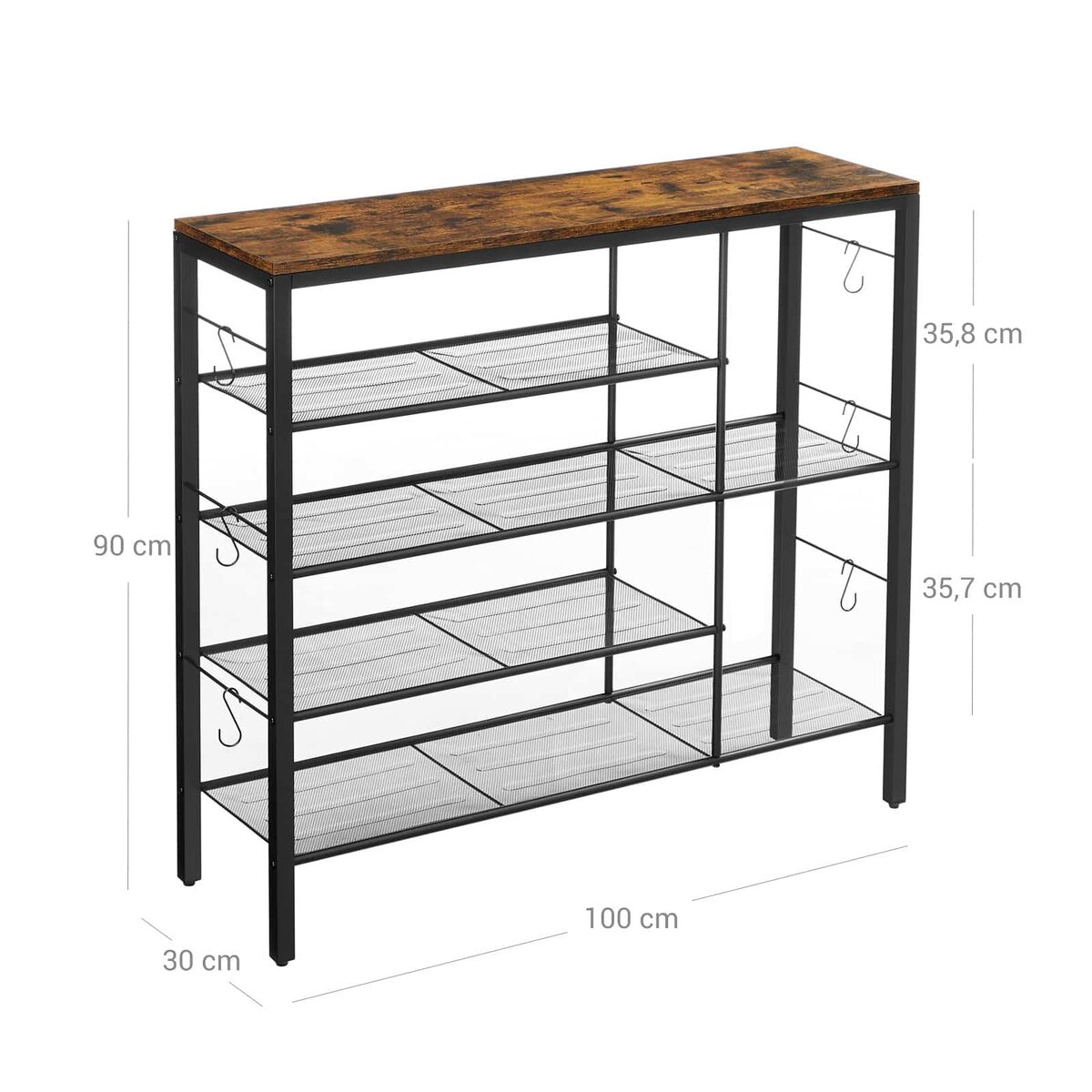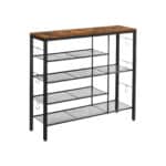 Ši vintažinė batų lentyna, ruda/juoda, yra puikus sprendimas jūsų namų interjerui. Pagaminta iš aukštos kokybės medžio drožlių plokštė (MDP) ir plieno, ji ne tik atrodo stilingai, bet ir yra labai patvari.