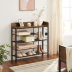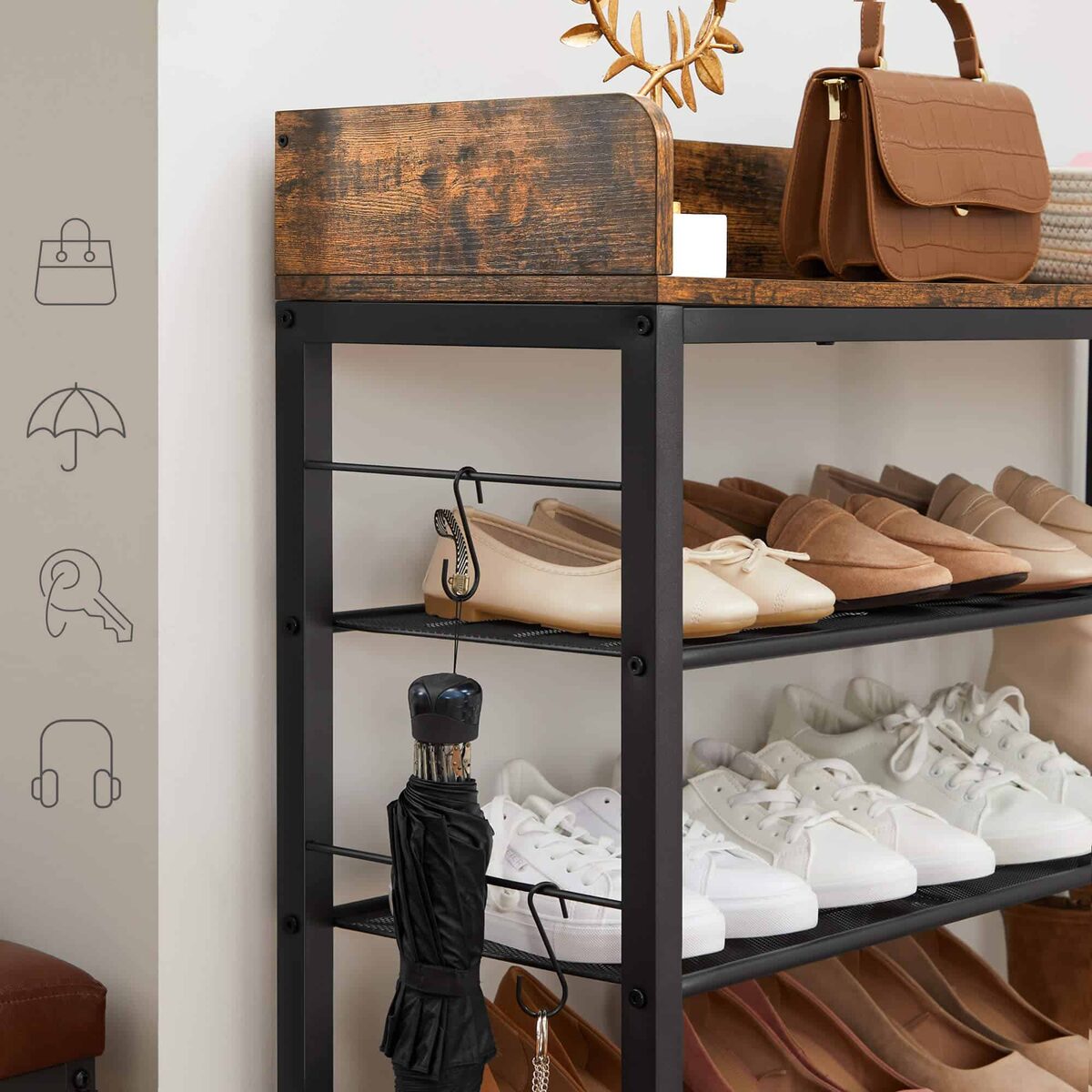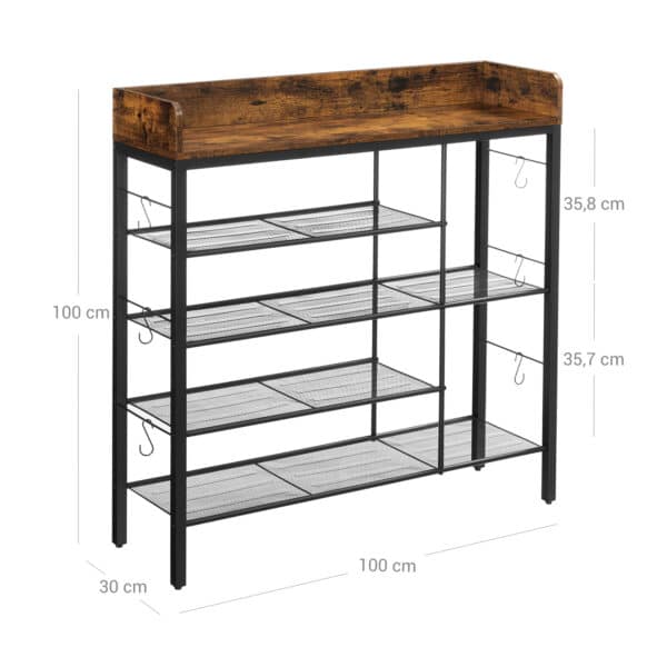 Ši vintažinė batų lentyna, ruda/juoda, yra puikus pasirinkimas tiems, kurie vertina stilingą ir funkcionalų interjerą. Pagaminta iš aukštos kokybės medžio drožlių plokštė (MDP) ir plieno, ši lentyna ne tik atrodo elegantiškai, bet ir yra itin patvari.