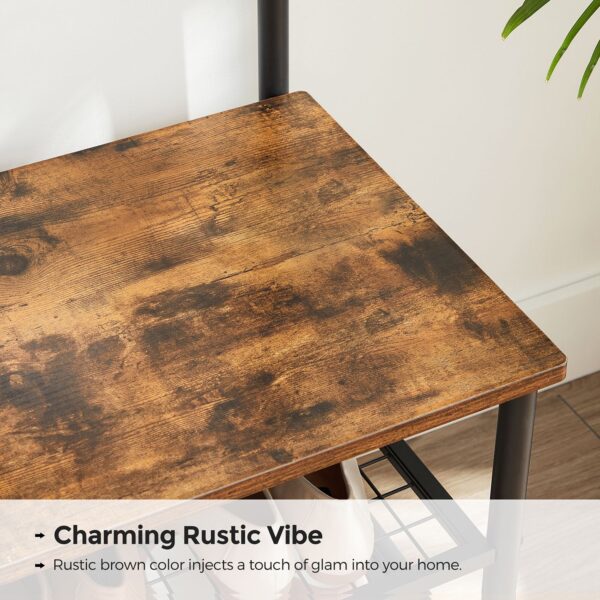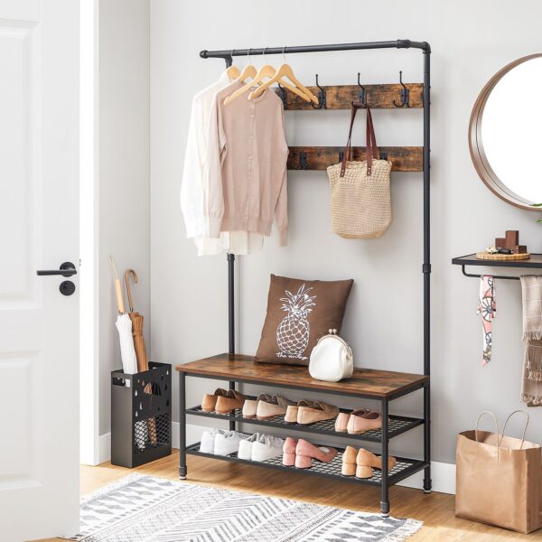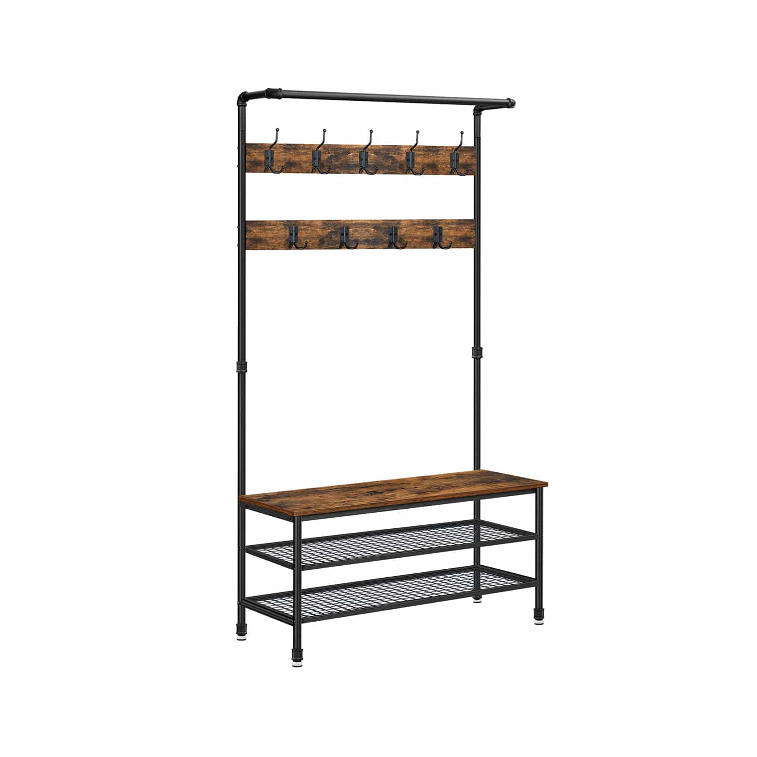Kaimiška pramoninio dizaino viršutinių drabužių kabykla ant ratukų HSR47BX, rudos/juodos spalvos, yra puikus pavyzdys. Ji sukurta su suoliuku, kuris suteikia patogią sėdėjimo vietą, ir dviem grotelių lentynomis batams laikyti. Taip pat yra drabužių kabyklos ir 9 kabliukai raktams, krepšiams ar drabužiams laikyti.