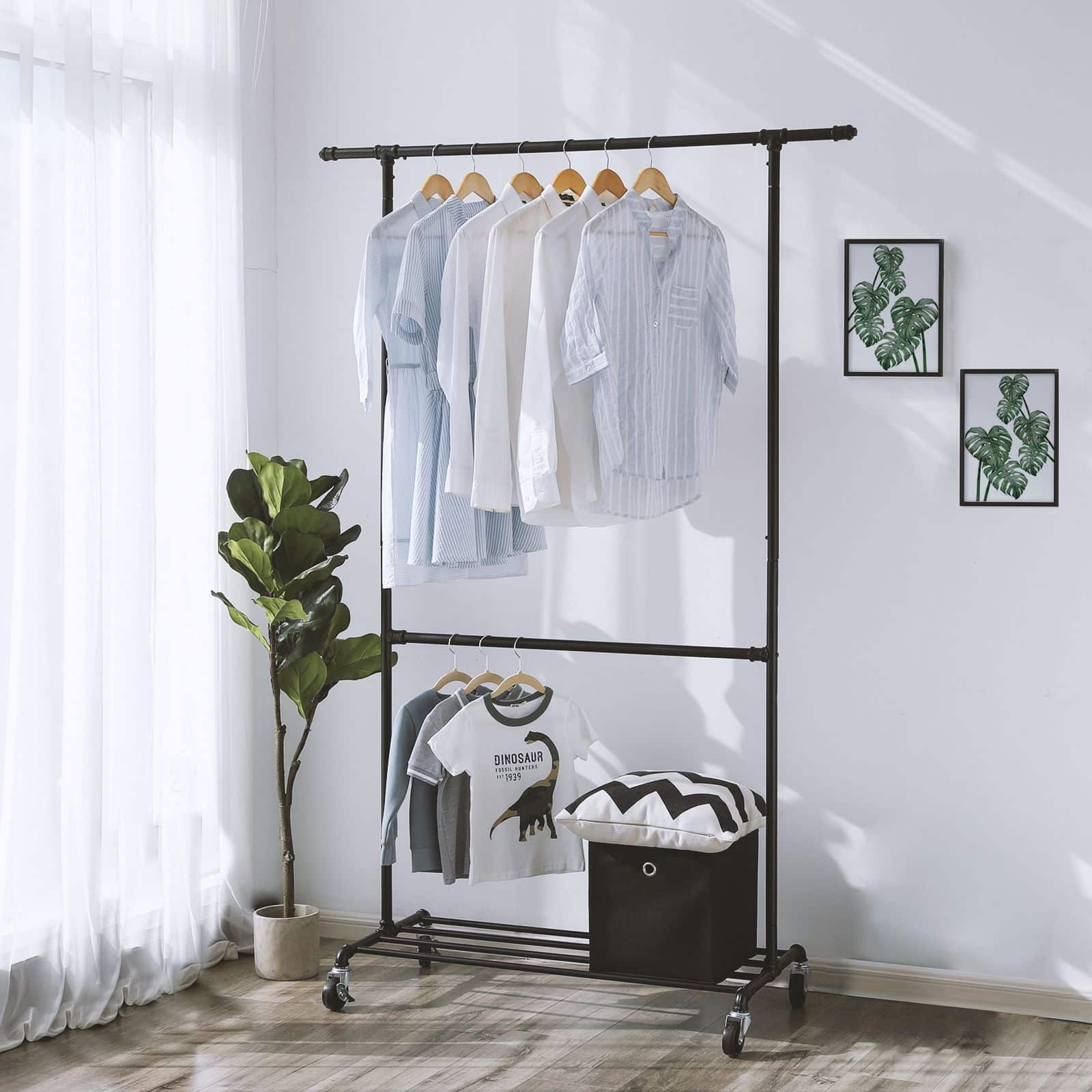 Elegantiškas prekių pristatymas. Dėl vintažinio ir pramoninio dizaino stiliaus derinio ši SONGMICS drabužių kabykla yra tikras brangakmenis drabužių parduotuvėms, butikams ir panašioms vietoms. Tiek ilgos, tiek trumpos drabužių dalys telpa ant apatinio drabužių bėgelio, nes jį galima reguliuoti iki 4 aukščių. Be to, drabužių kabykla yra ypač praktiška dėl ratukų, nes galite lengvai transportuoti drabužius pirmyn ir atgal savo parduotuvėje. Šiuo metu taip pat teikiama paraiška patentuoti šią drabužių kabyklą su dvigubu drabužių kabykla.