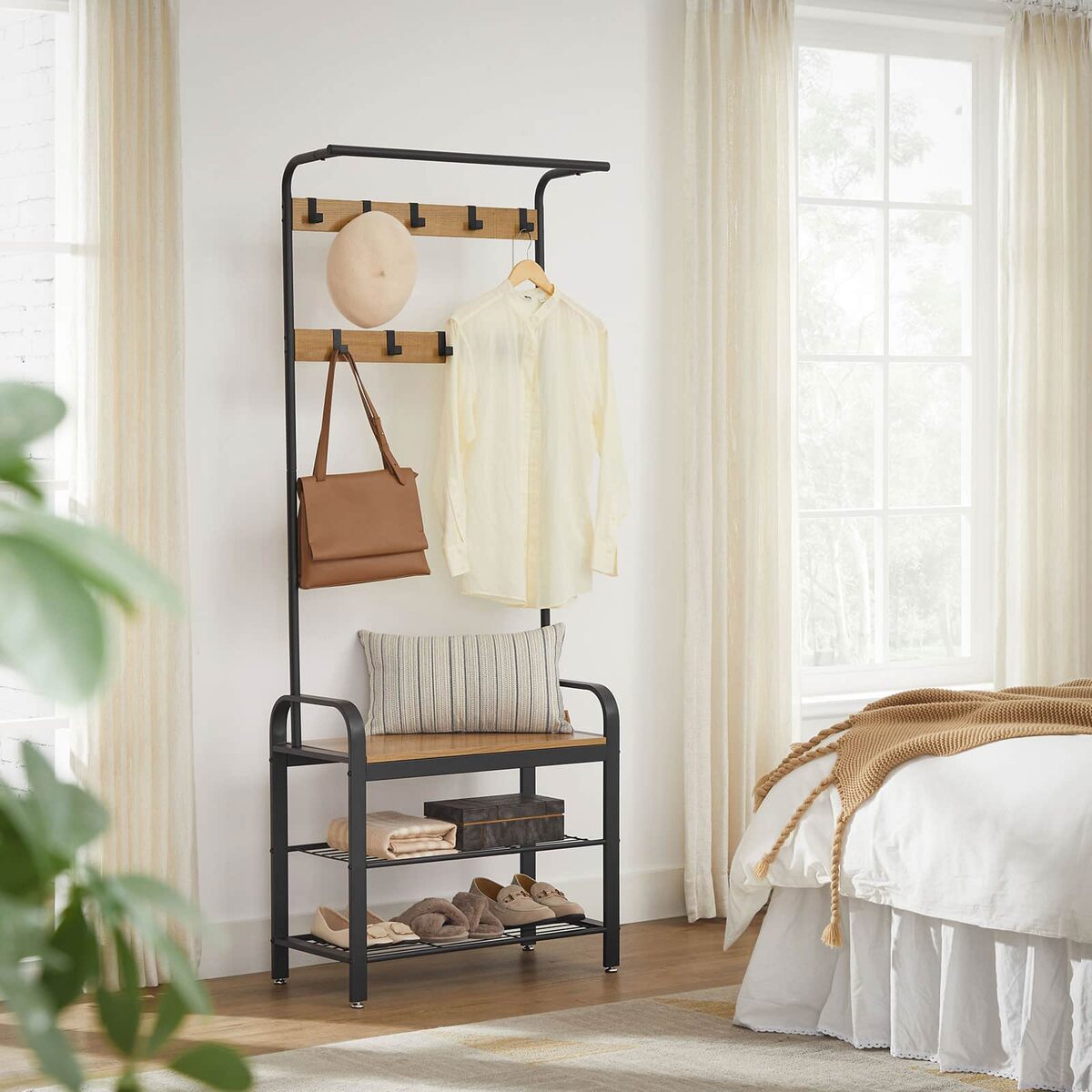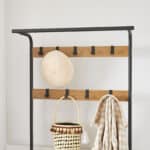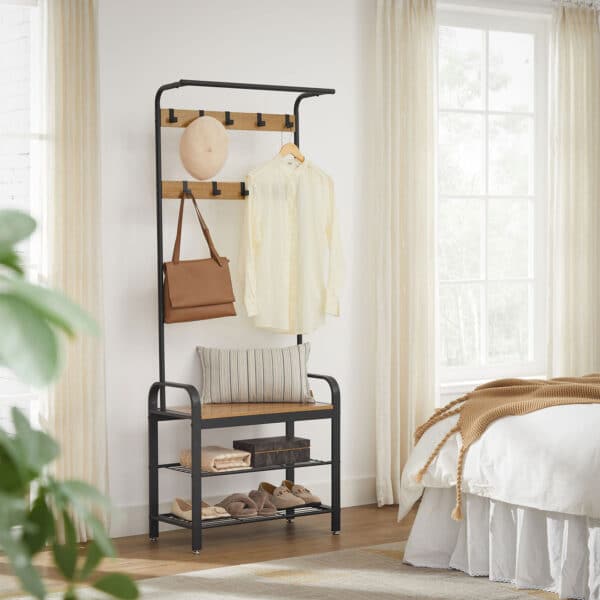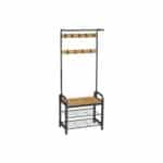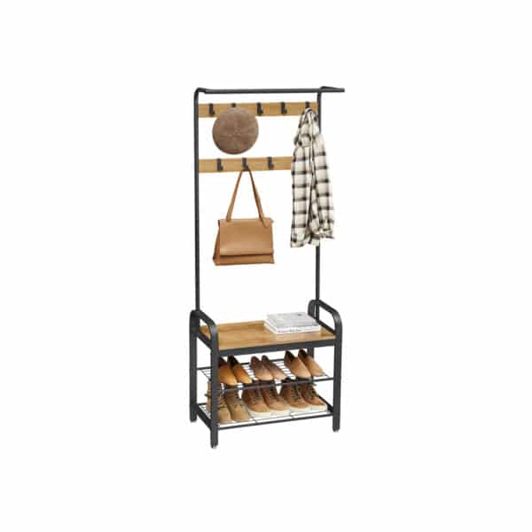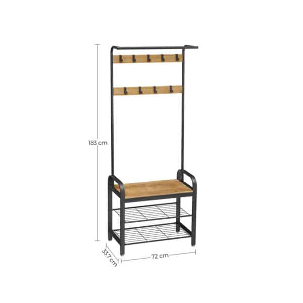 Viršutinių drabužių kabykla ir batų suoliukas HSR040B05, rudos/juodos spalvos, yra puikus sprendimas jūsų namų organizavimui. Šis funkcionalus baldas ne tik padės tvarkingai laikyti drabužius, bet ir suteiks vietą patogiai atsisėsti, kai apsiaunate batus.