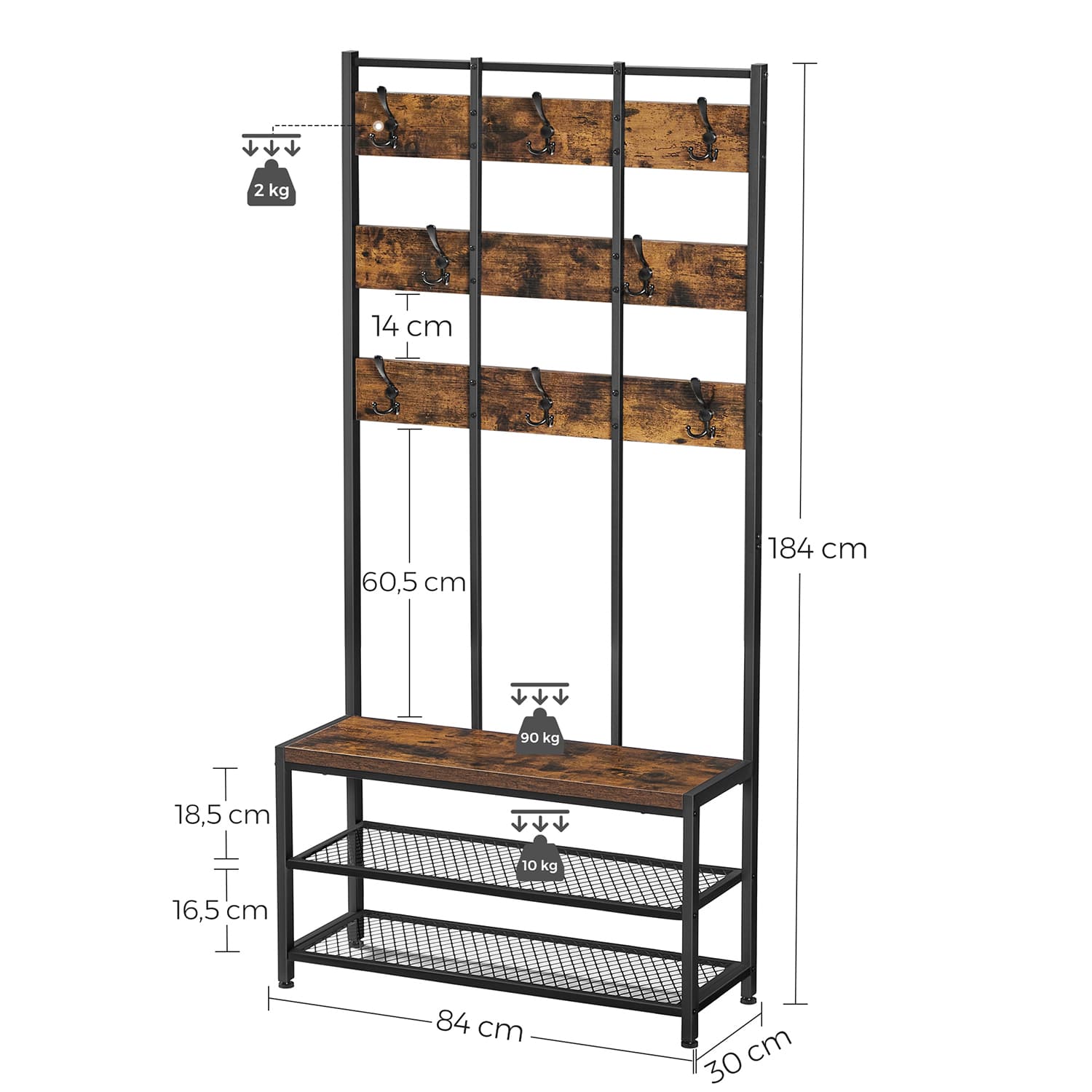 Viršutinių drabužių kabykla ir batų suoliukas HSR087B01, rudos/juodos spalvos, yra puikus sprendimas jūsų namų organizavimui. Šis funkcionalus baldas ne tik padės tvarkingai laikyti drabužius, bet ir suteiks vietą patogiai atsisėsti, kai apsiaunate batus.